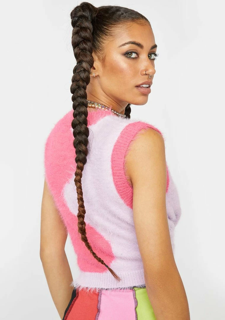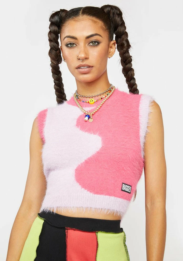 because you’re so otherworldly. This vest has a fuzzy knit construction, a sleeveless design, a two tone zig zag design, and a Ragged Priest logo patch.
