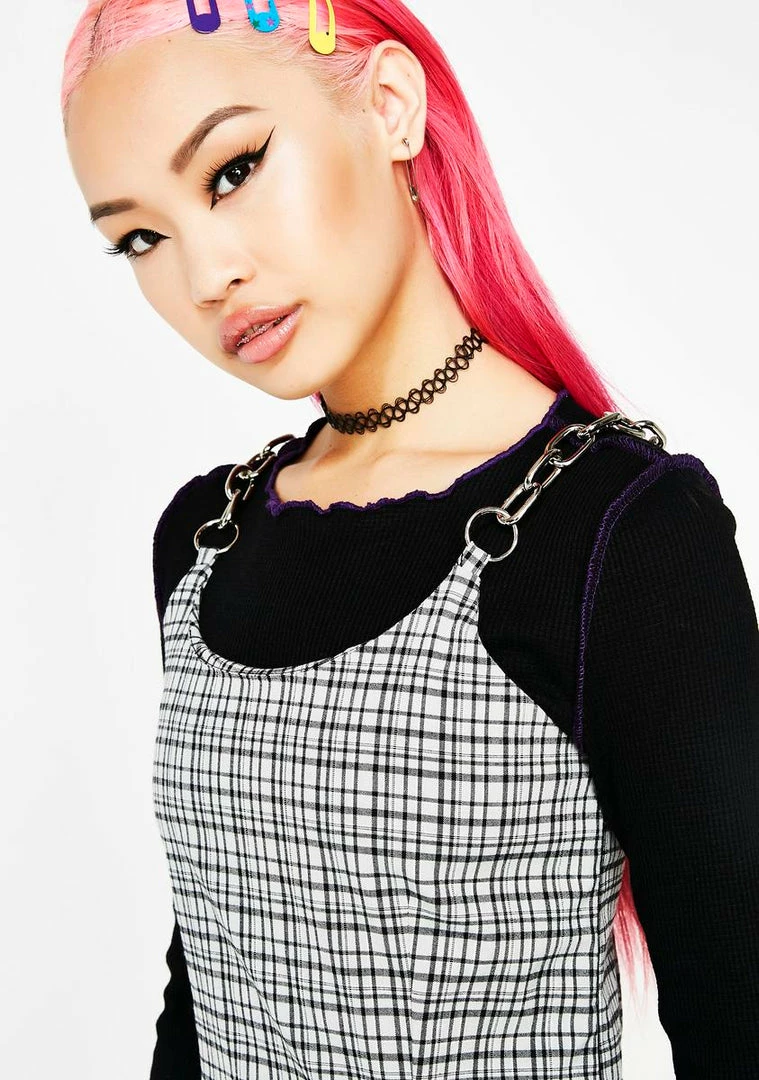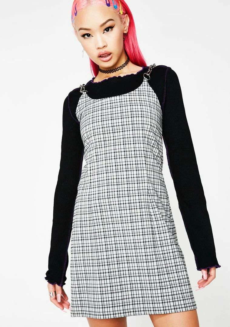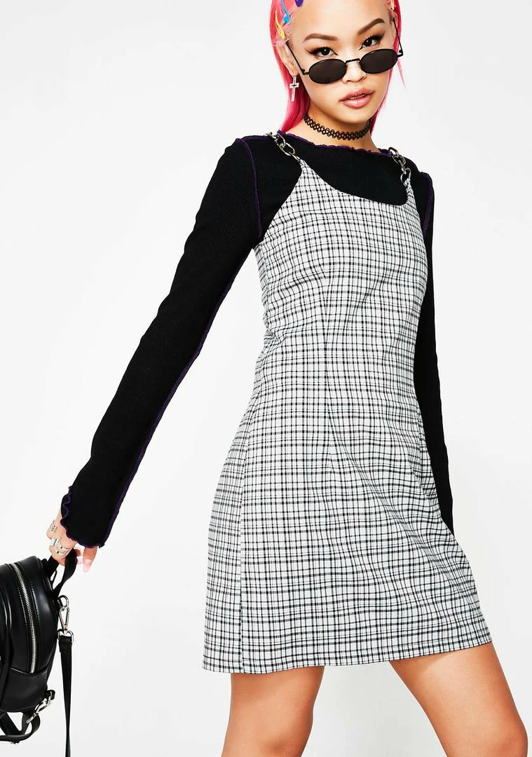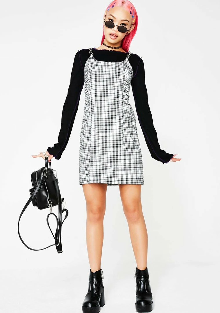 cuz ya put in werk babe! Put the haters in the dirt in this dope plaid mini dress that has a scoop neck, bike chain strap details Nรขยย a side zip closure.