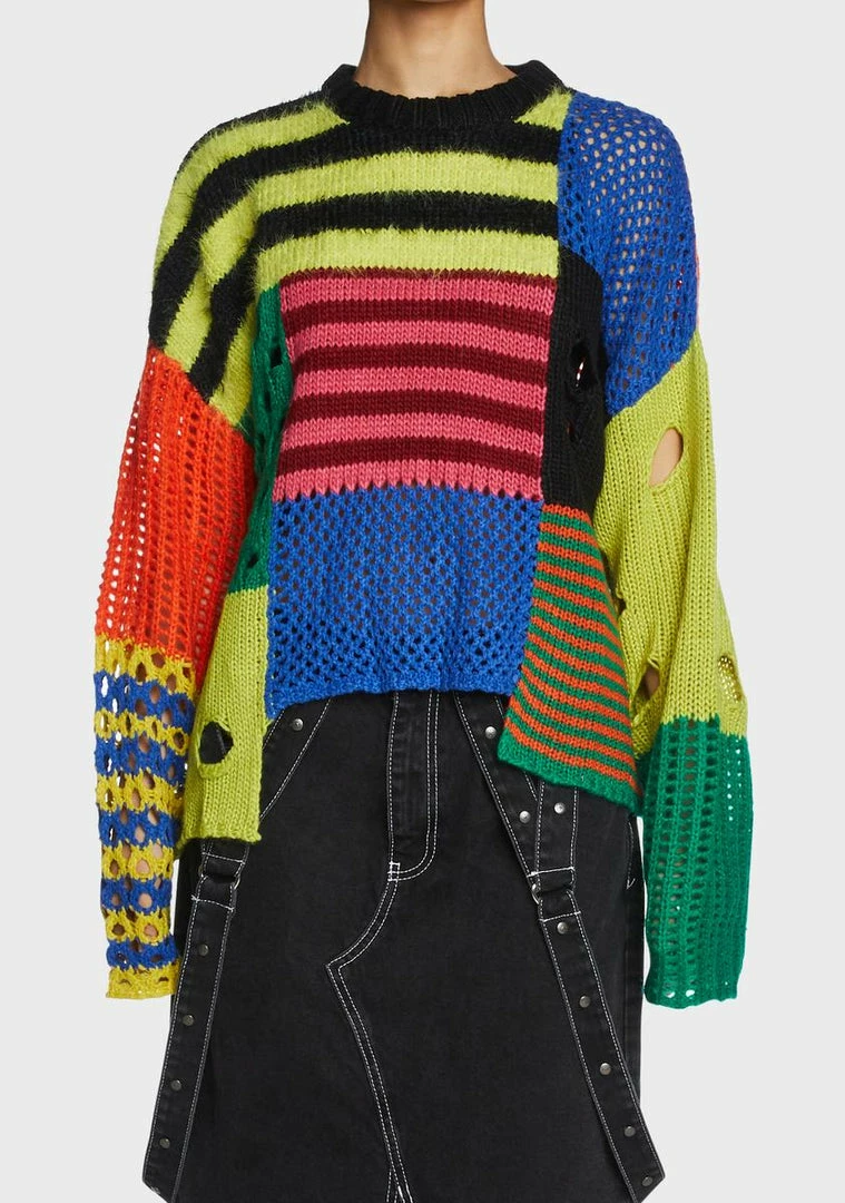 never let your colors fade! This cropped sweater has a patchwork striped print and open weave construction, a boxy oversized fit, and long sleeves.