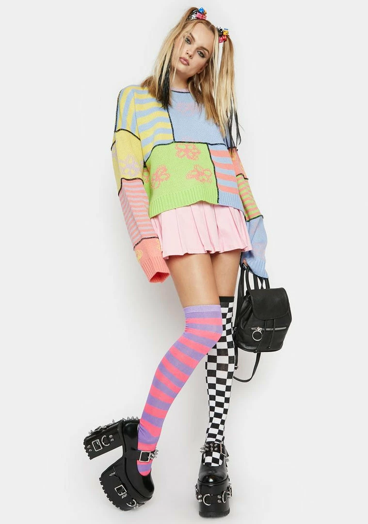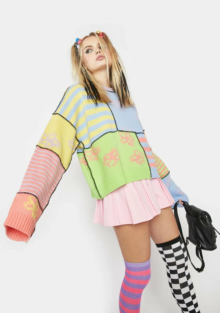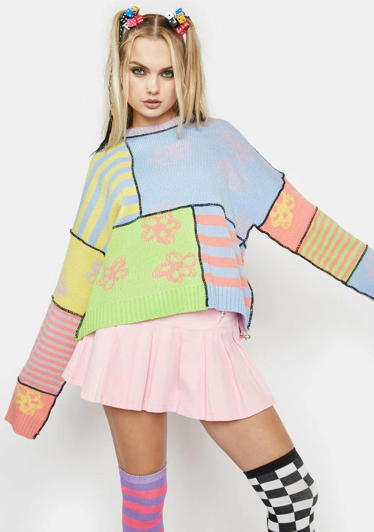 has a relaxed fit, long sleeves, ribbed knit trim at the crew neckline, hem and cuffs, a patchwork design with floral and striped patches, and contrast colored stitching.