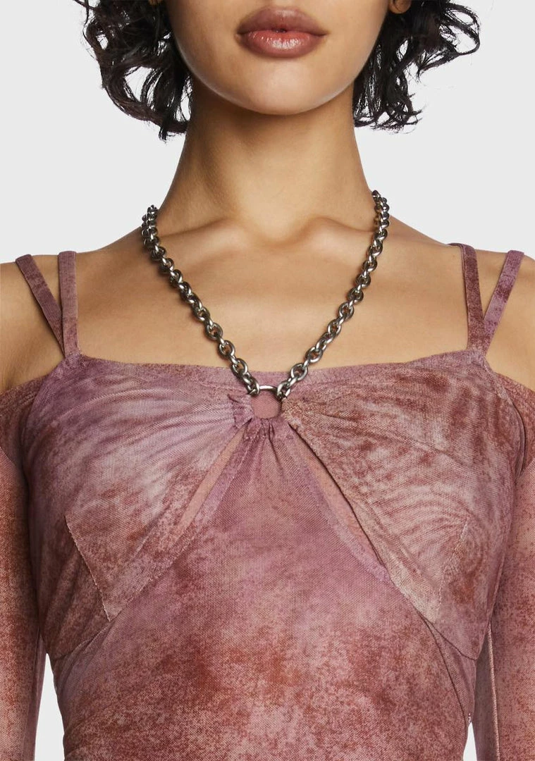 cuz you just wanna be a fairy. This bardot mini dress has a double layered mesh construction, off the shoulder long sleeves, an asymmetrical ruffle skirt, and a chain halter neck detail.