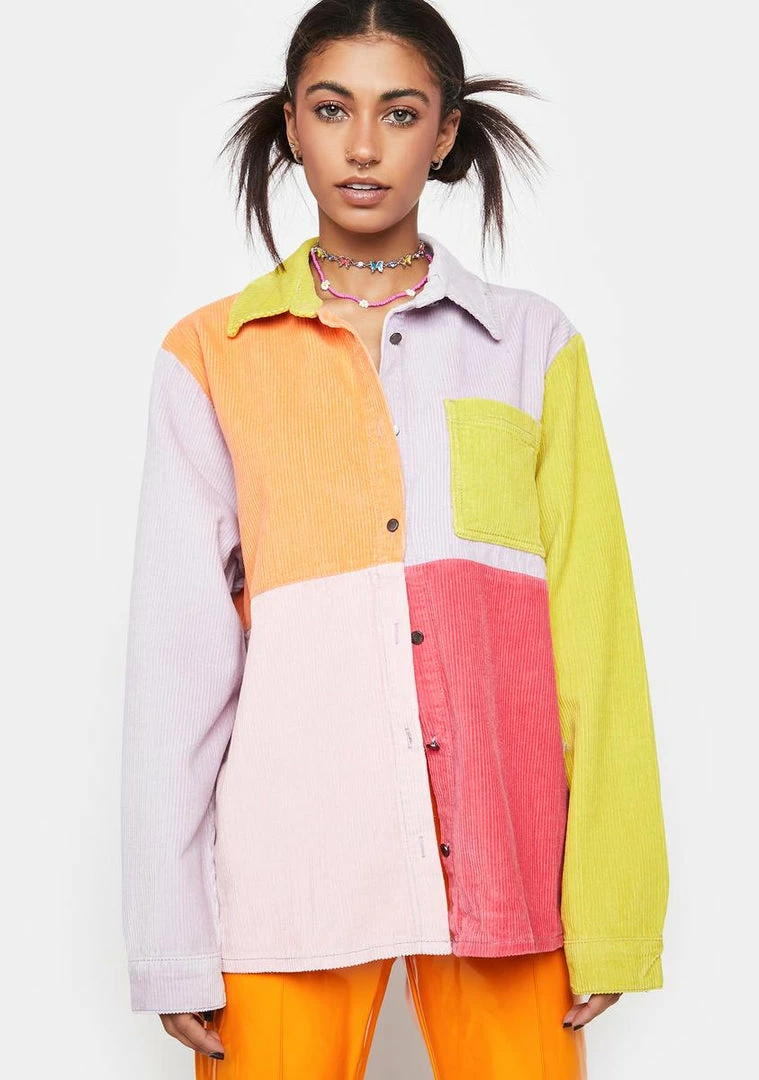 cuz youΓ’ΒΒre on another level! This colorful button up shirt has a patchwork corduroy construction, a single chest pocket, and a boxy relaxed fit.