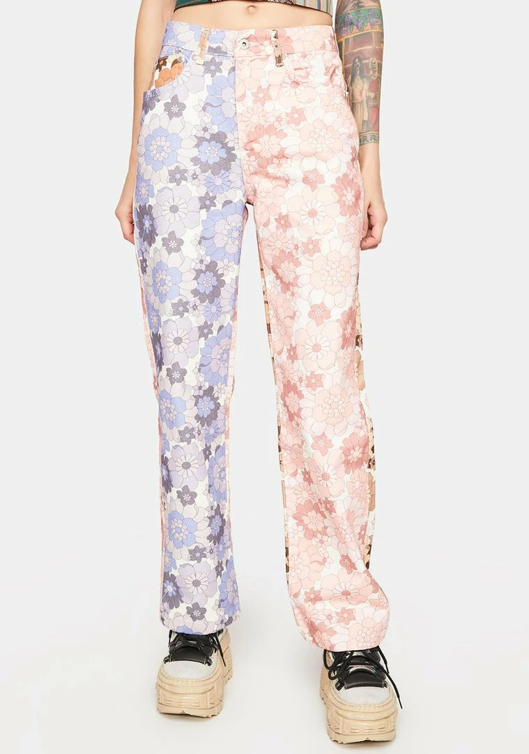 give ’em flower power! These denim jeans have a floral print all over with a half and half design and pockets on the front and back.