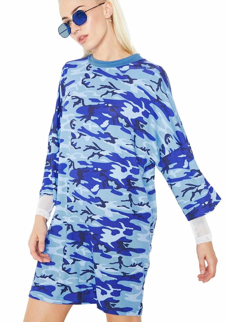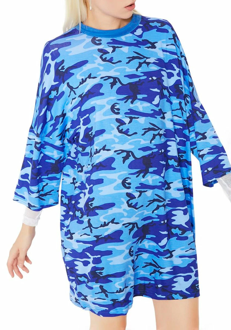 why hide when you look this good?! Step out in this dope t-shirt dress that features a loose Nรขยย comfy fit, round neckline, and a blue camo print all ova.