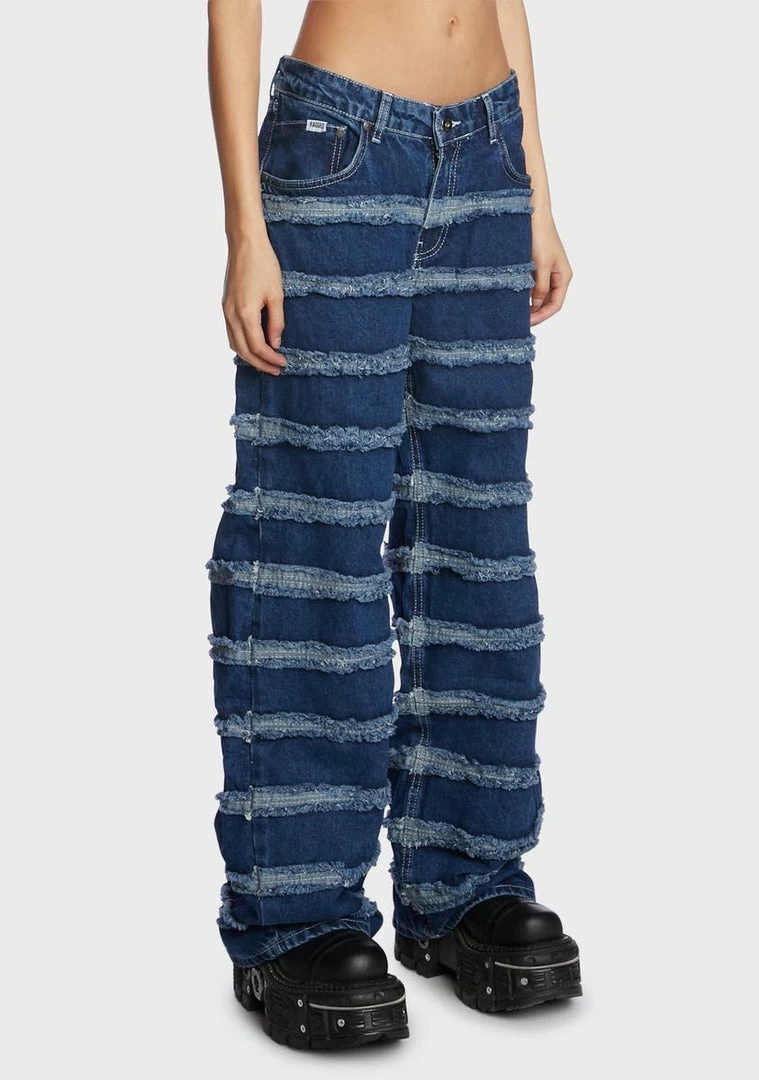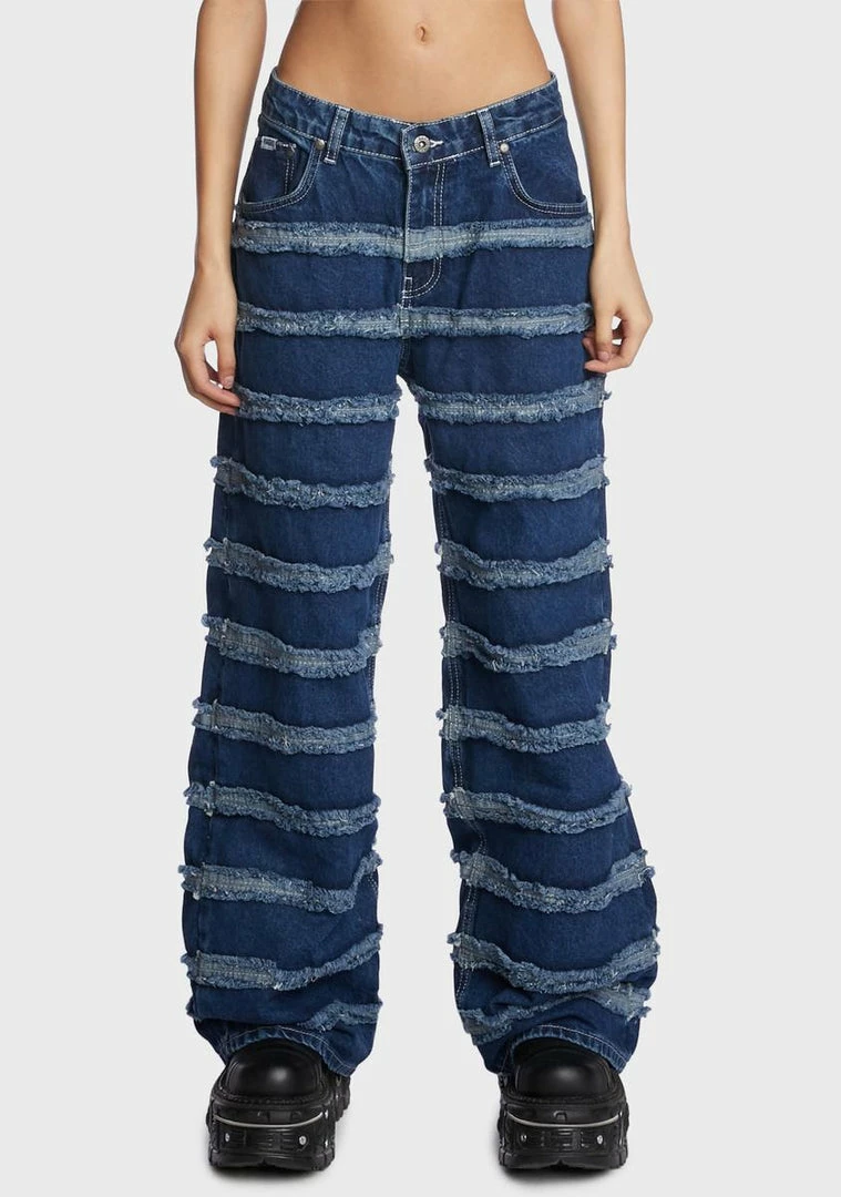 now I’ve got you in my space! These low-rise jeans have a denim construction, frayed seam detailing all over, a zip-fly closure, and baggy wide legs.