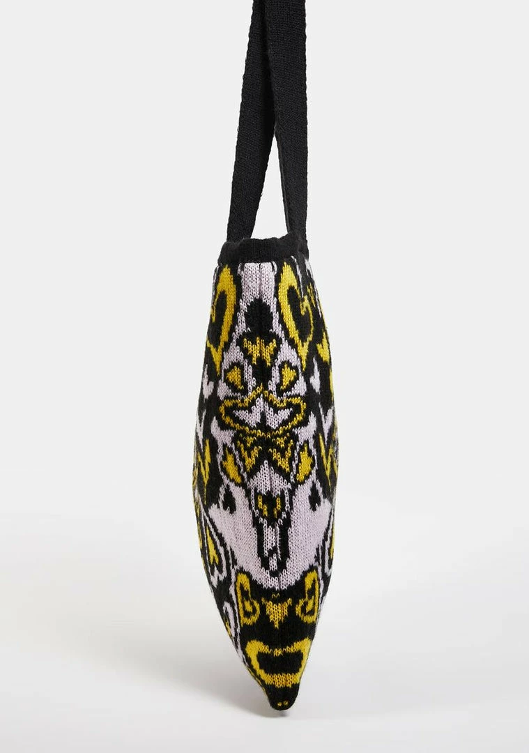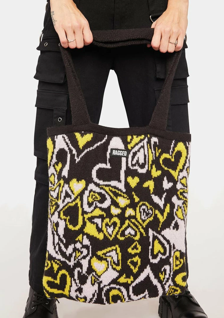 give ’em real love! This tote bag has a knitted construction and a heart pattern all over.