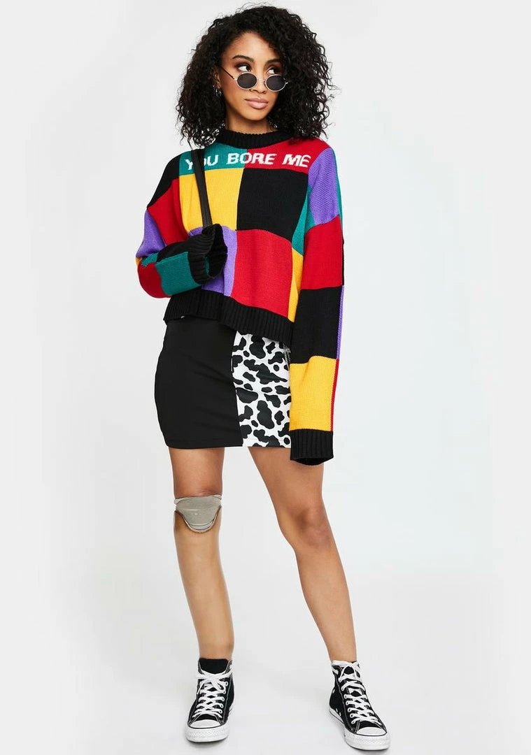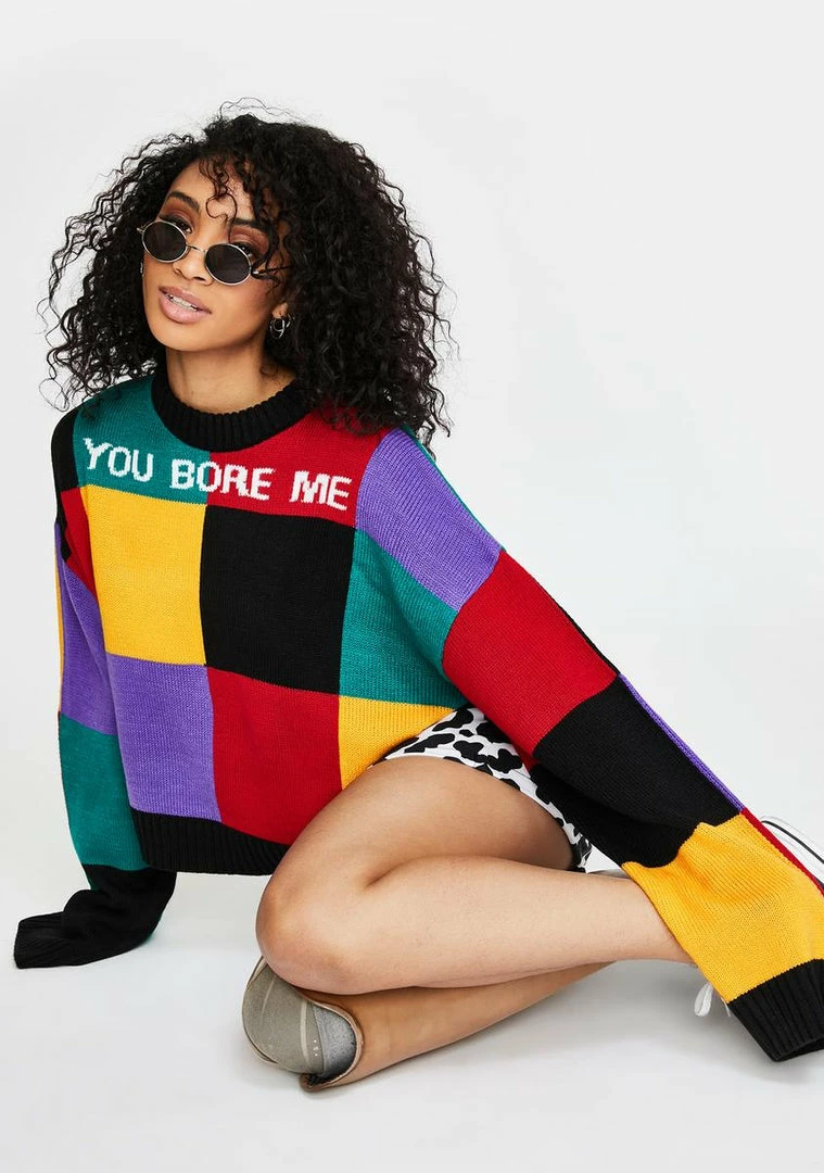 will tell Γ’ΒΒem to read it and weep. TheyΓ’ΒΒre boring you to death in this color block knit sweater that has long sleeves, ribbed trim, a slouchy oversized fit NΓ’ΒΒ text graphics on the front.