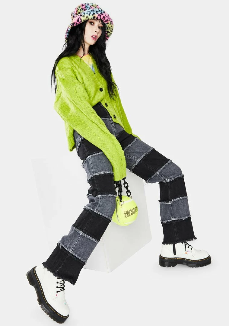 have a stripe paneled design with distressed detailing and a high waist fit. These colorblock denim jeans have a wide leg cut and pockets on the front and back.