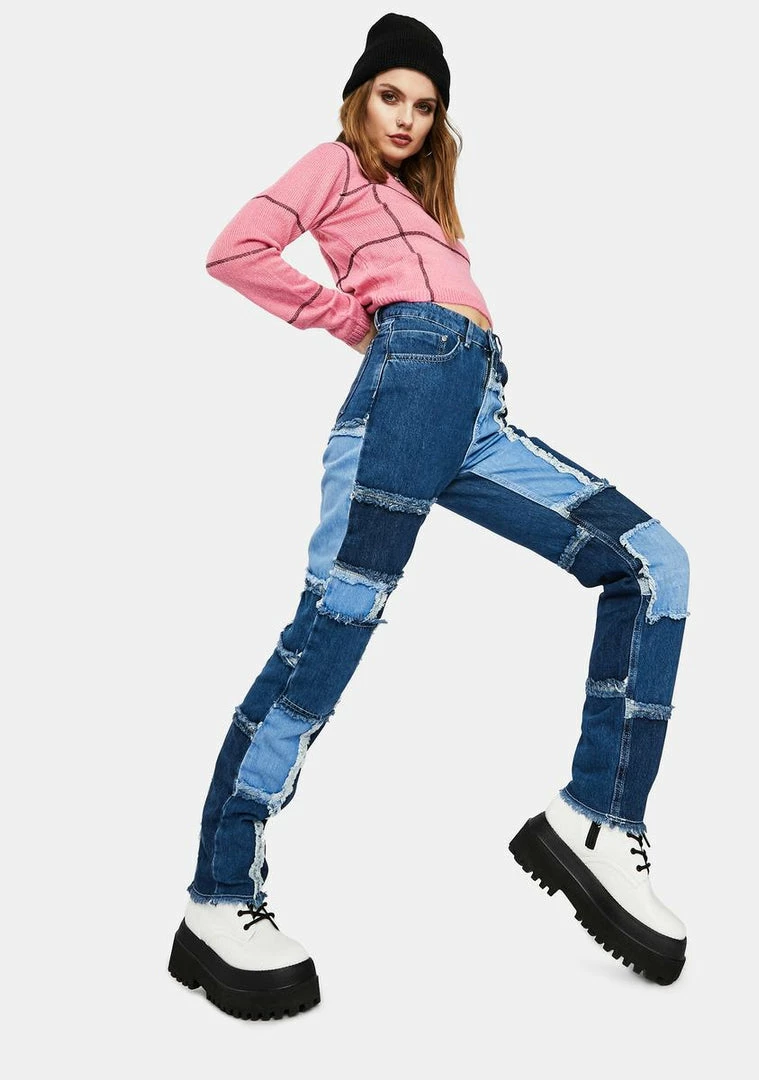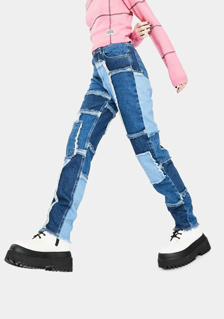 hope it gives you hell. These sikk high waist mom jeans have a unique patchwork design with frayed detailing, a classic five pocket design, and a buttoned zip closure.