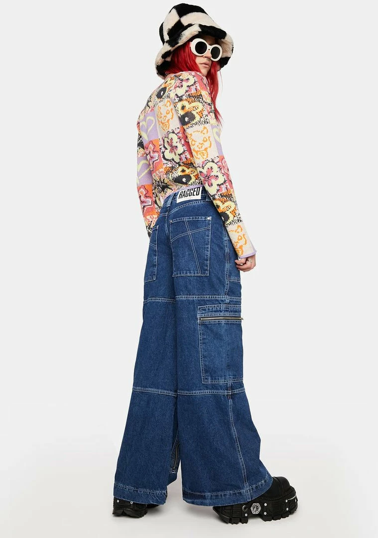 cuz you march to the beat of your own drum. These wide leg denim jeans have a low rise fit, cargo pockets all over, and a zip-fly closure.