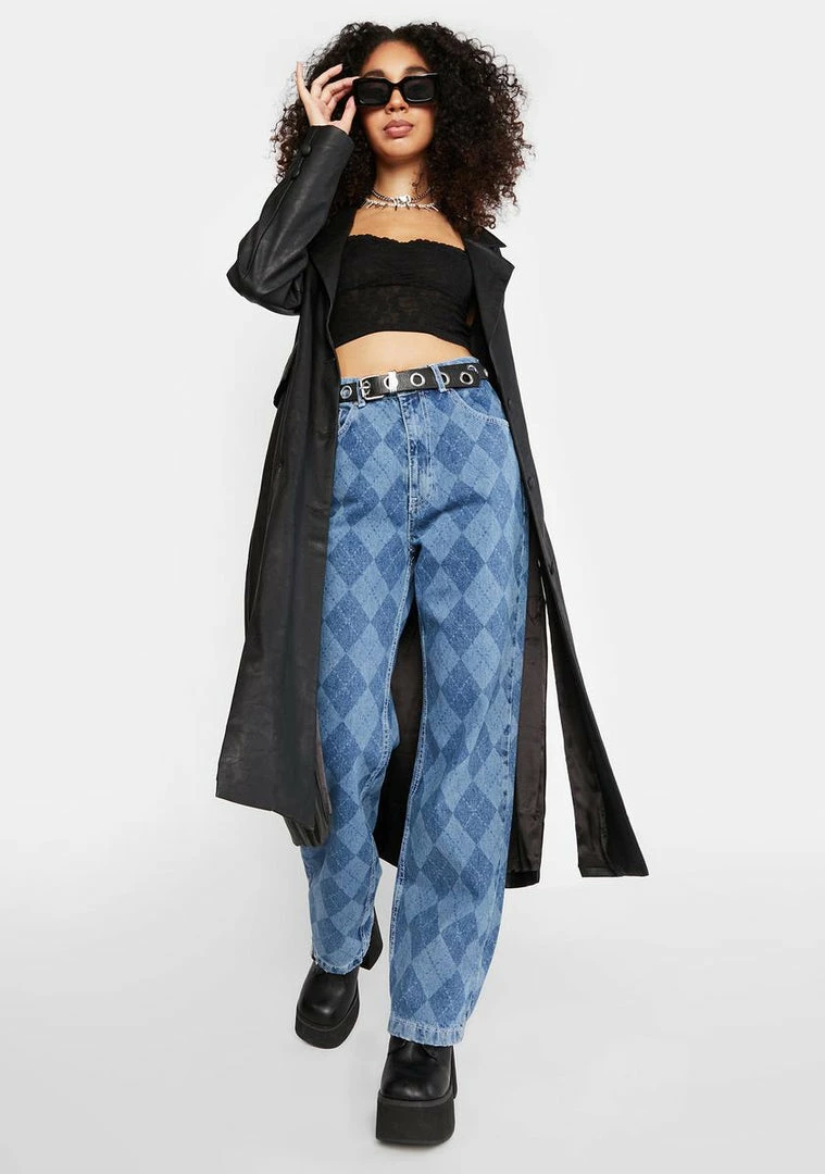 cuz you’ve got bad behavior. These denim dad jeans have a high waist fit, front and back pockets, and an argyle print all over.