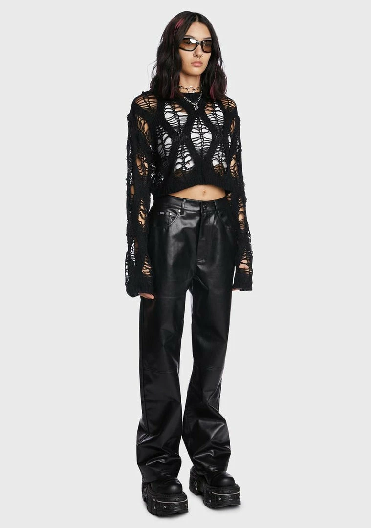 cuz it’s time to face yourself. These high-waisted pants have a non-stretch vegan leather construction, classic 5-pocket styling, a front zip-fly closure, and baggy legs.