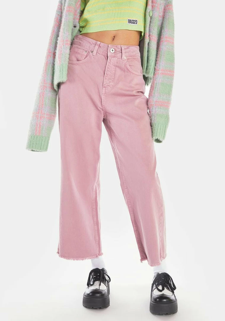 have a high rise waistline, a wide leg fit, a cropped ankle with a raw hem, a medium wash, and a Ragged Priest belt loop patch.