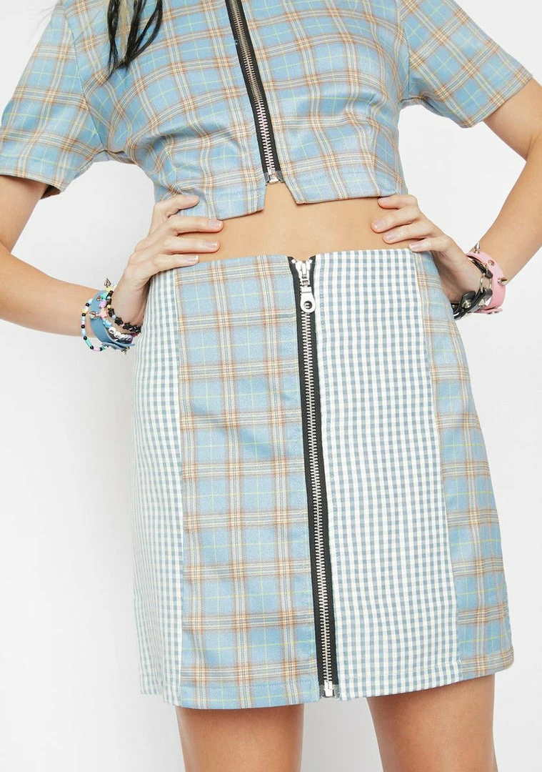 has an a-line fit, a high rise waistline, a patchwork pattern with checkered and plaid patches, and a zipper closure up the front.