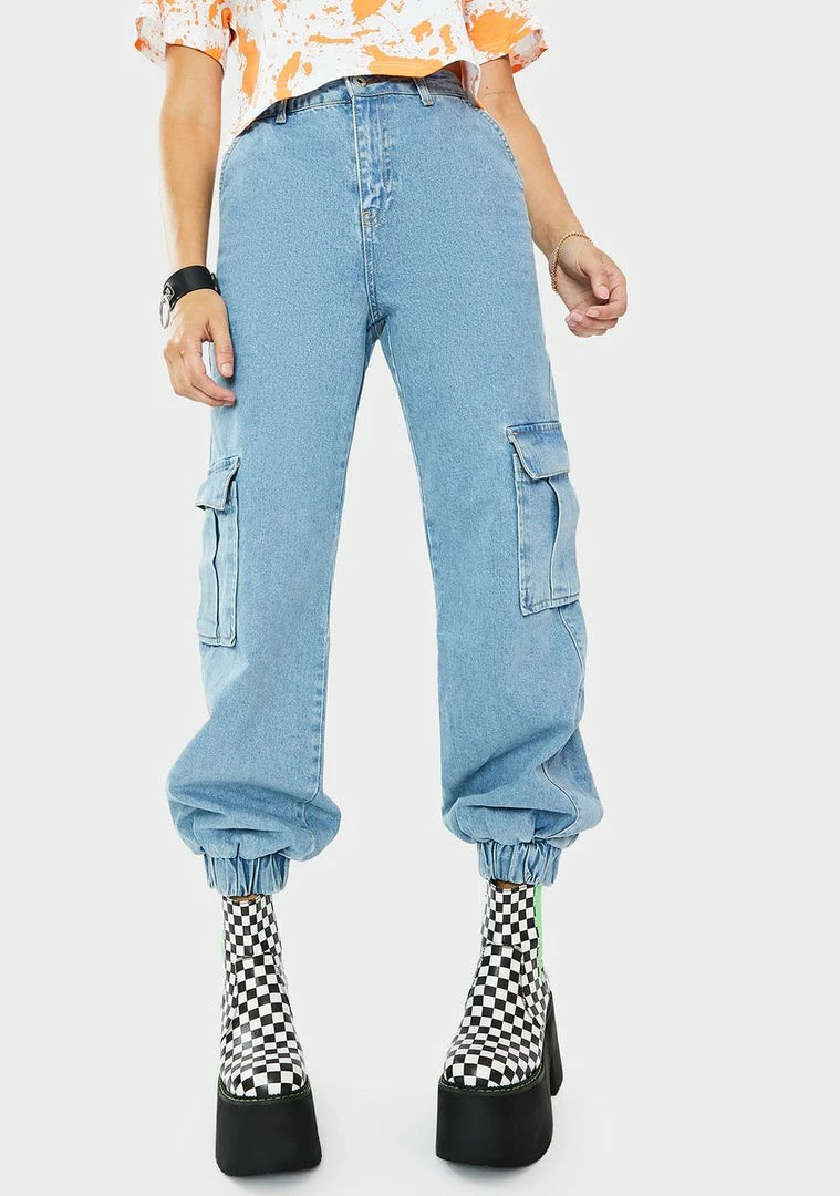 because youΓ’ΒΒre different than the rest of them. These high rise denim jeans have cargo pockets and elastic jogger cuffs at the hem.