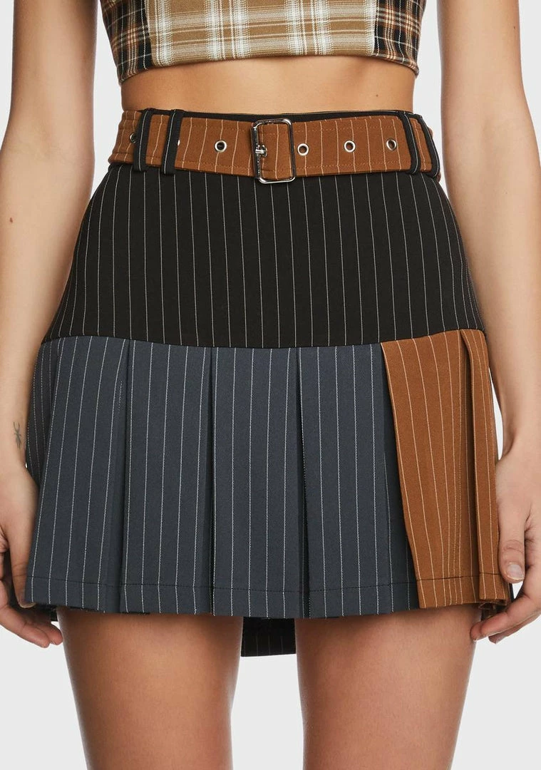 if anything, you’re everything! This high-waisted mini skirt has a non-stretch pleated cotton construction, a patchwork striped print all over, and an adjustable buckled belt.