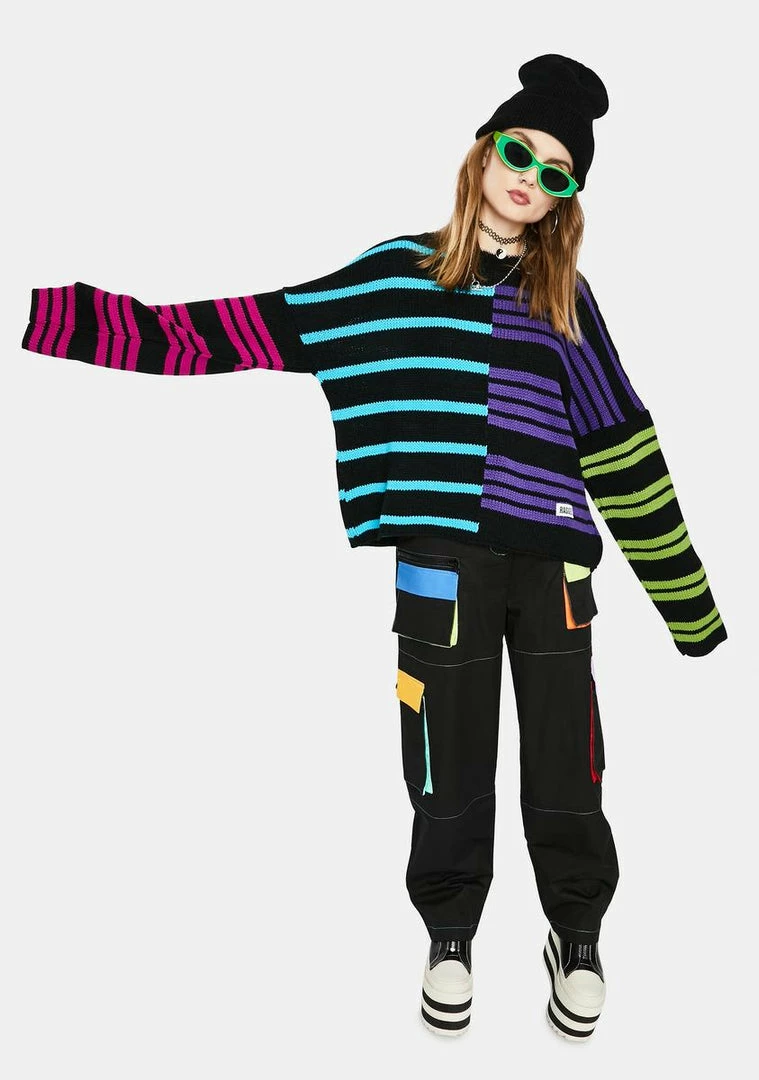good vibes only. This chunky knit sweater has a multi-colored stripe pattern and an oversized fit.