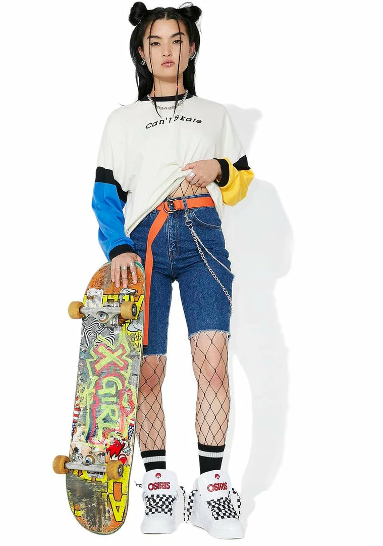 cuz we canΓ’ΒΒt be the best at everythingΓ’ΒΒ¦ except fer yew, babe! Show Γ’ΒΒem what yew got in this tee that features a colorblocked construction, contrasting blue and yellow sleeves with black stripes, and an off-white body with black Γ’ΒΒCanΓ’ΒΒt SkateΓ’ΒΒ text goinΓ’ΒΒ across yer chest.