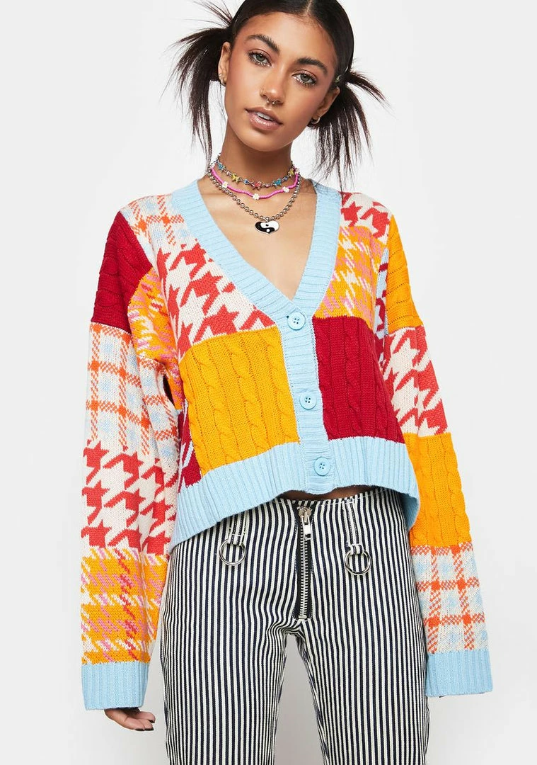 cuz you’re the sugar rush we’re craving! This slouchy knit cardigan has long sleeves, a plunging V-neckline, button up closures, and patchwork pattern design all over.