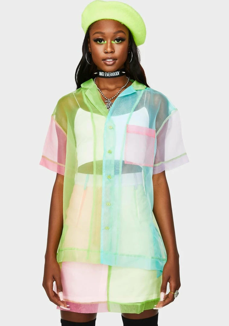 because everyone loves a throwback. This short sleeve organza shirt is totally see-through has a boxy shape, button-up closures and breast pocket.