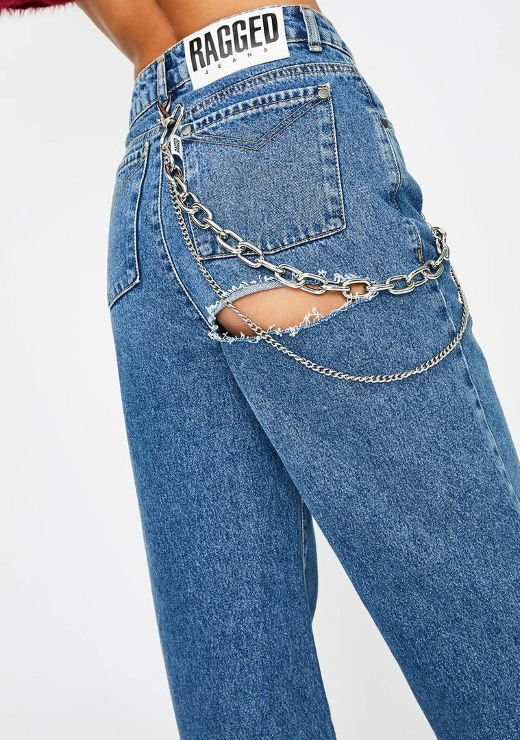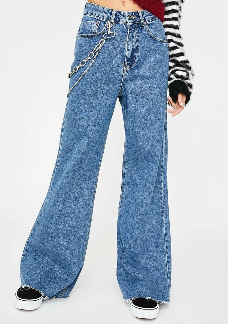 cuz youΓ’ΒΒre more a skatepark NΓ’ΒΒ chill kinda girl! Get cheeky in these sikk wide leg jeans that have a detachable waist chain, distressing on the butt, relaxxed fit, and low waistline.