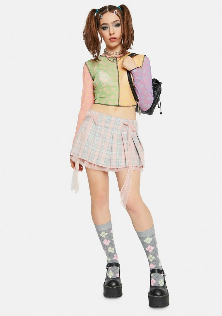 cuz you keep it cute. This long sleeve mesh crop top has a mixed floral patchwork design and contrast overlock seam details.