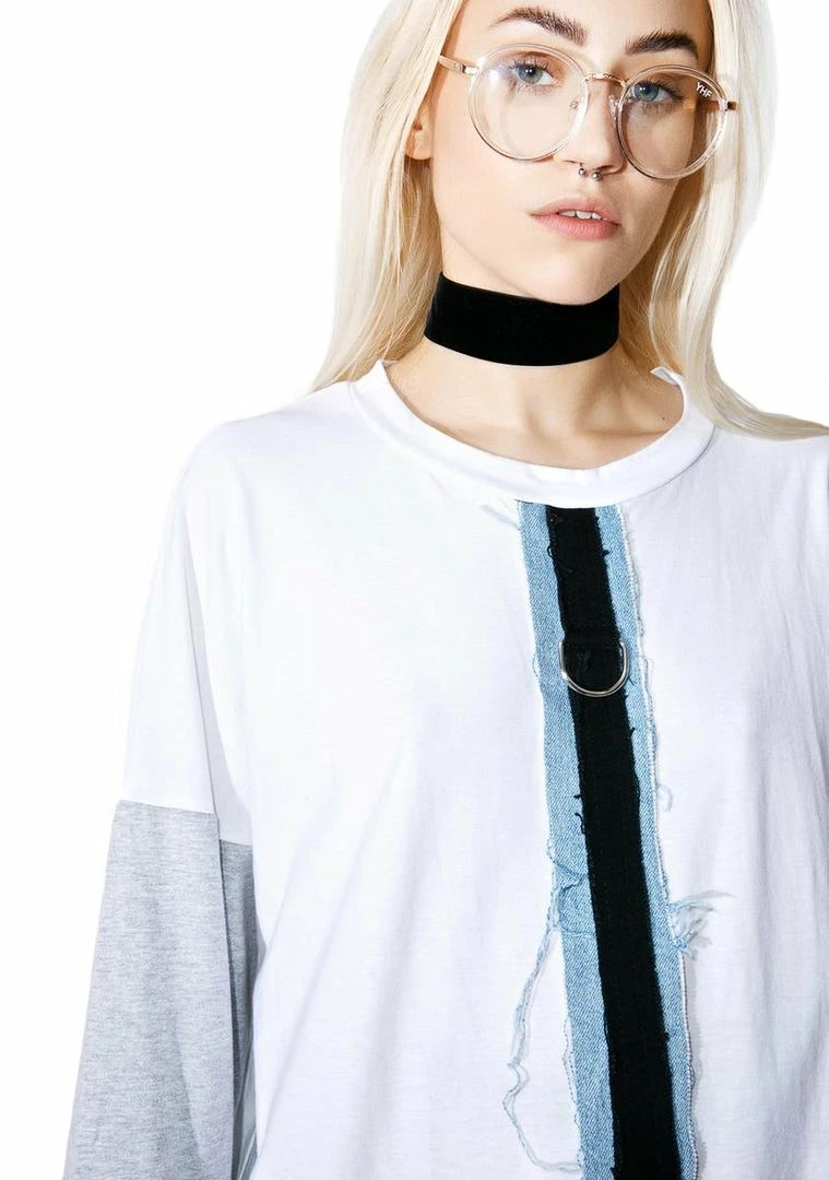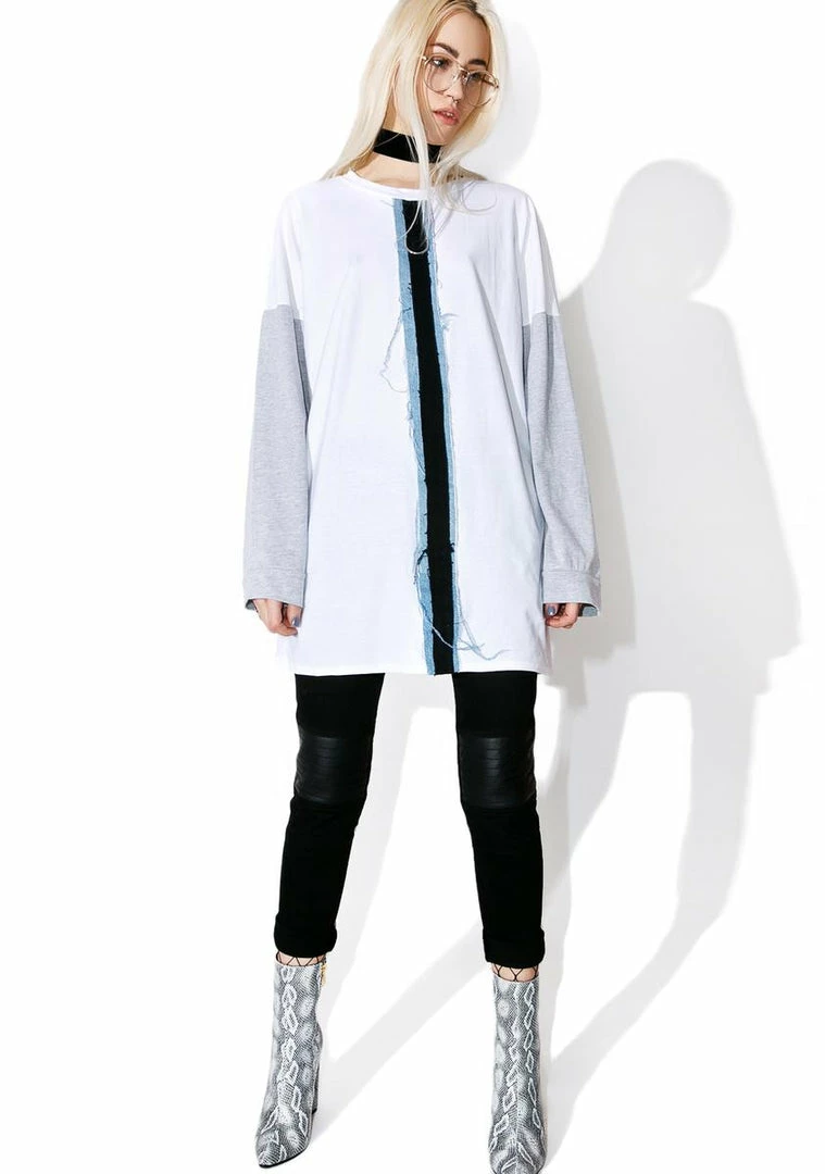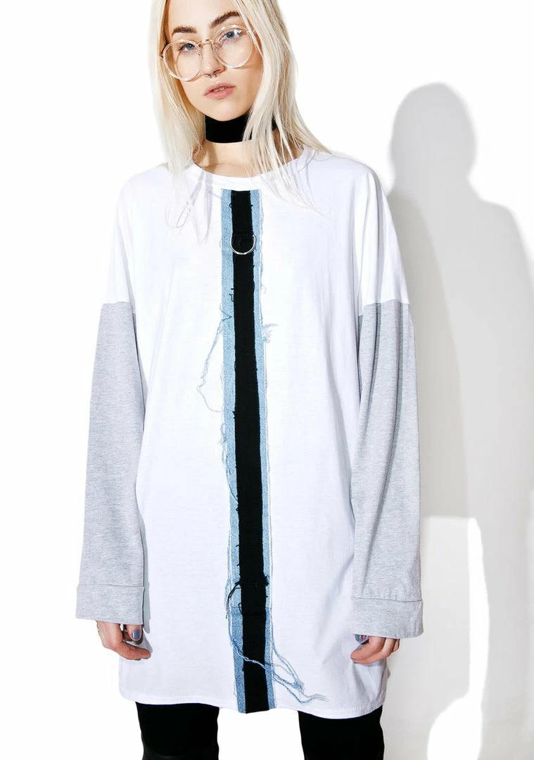 cuz yer not afraid to get up in their faces, bb. This dope dress features a slouchy white construction, dropped heather grey long sleeves, vertical stripe detail with baby blue frayed edges, and D-ring hardware on tha chest.