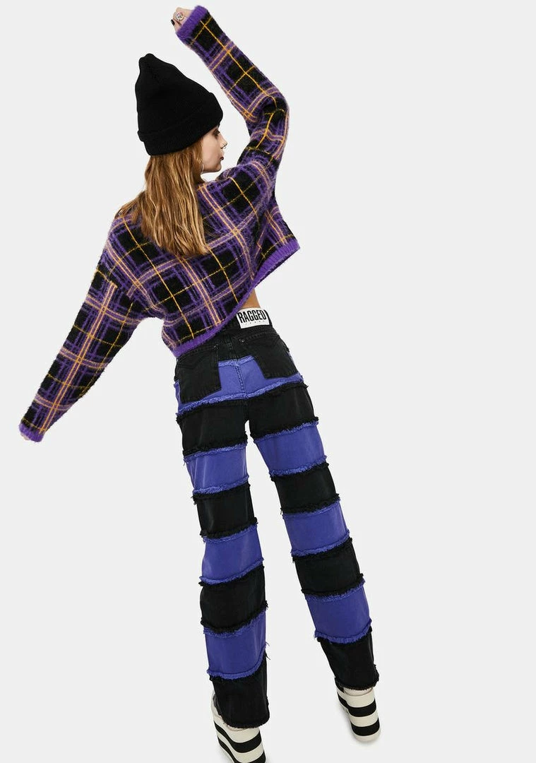 cuz youΓ’ΒΒre going wild, babe! This fuzzy knit sweater has a V-neckline, a slightly cropped fit, and a plaid pattern all over.