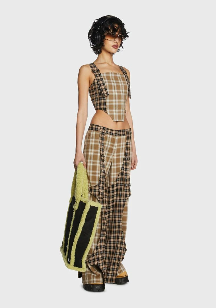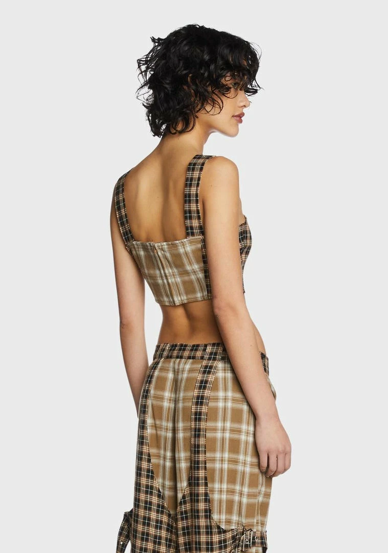 cuz you’re icon status. This corset top comes in a cropped fit, with adjustable buckle shoulder straps, a back zip closure, and plaid print all over.