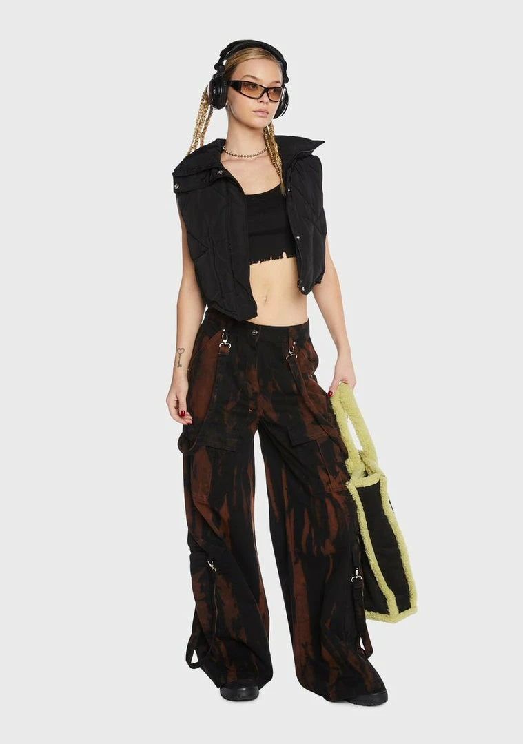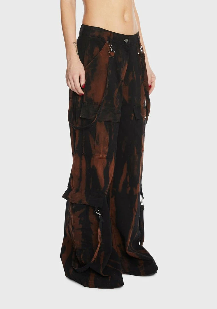 cuz be the leader. These cargo pants have an all over bleach tie dye design, a super wide leg silhouette, eight cargo pockets on the sides, front and back pockets, detachable straps, a low rise fit, and a button and zipper closure.