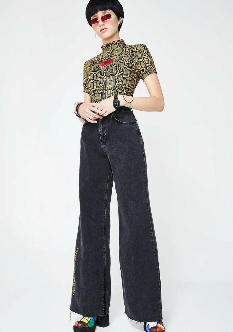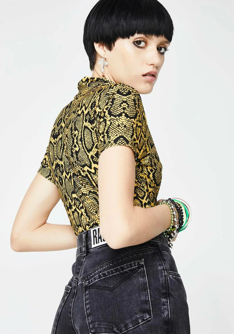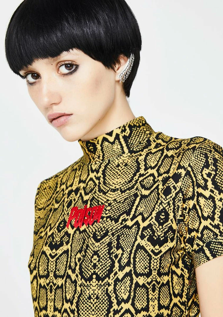 cuz you got emรขยย hooked on you. Keep emรขยย wanting more with this top that has a red flocking Poison detail on the front and a snake print all ova.