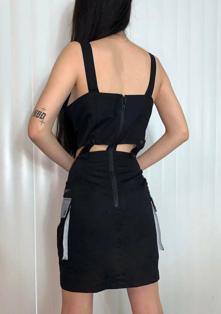 make tha world your runway bb! Look straight from the future wearing this mini dress with utility straps and pocket panels all over.