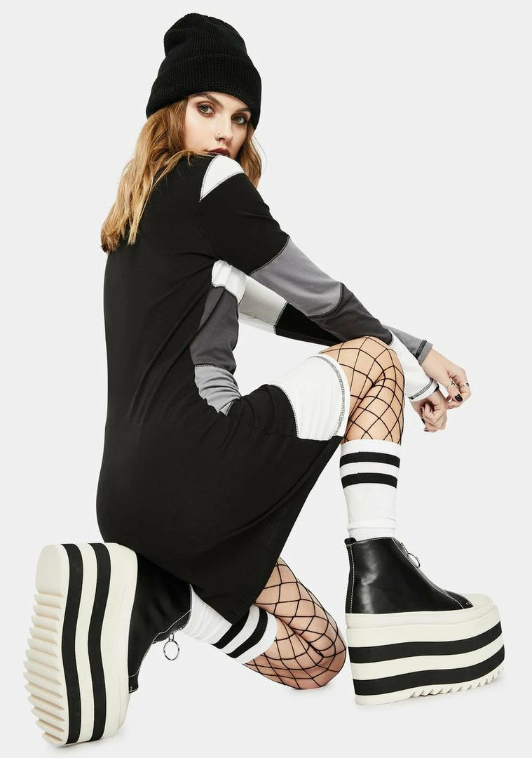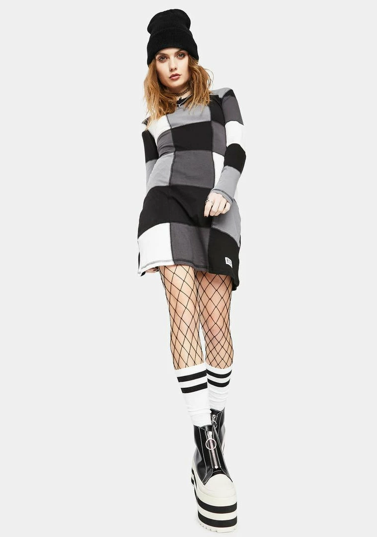 cuz you got their attention. This mini dress has long sleeves, exposed stitching details with a patchwork design, and a logo patch detail.