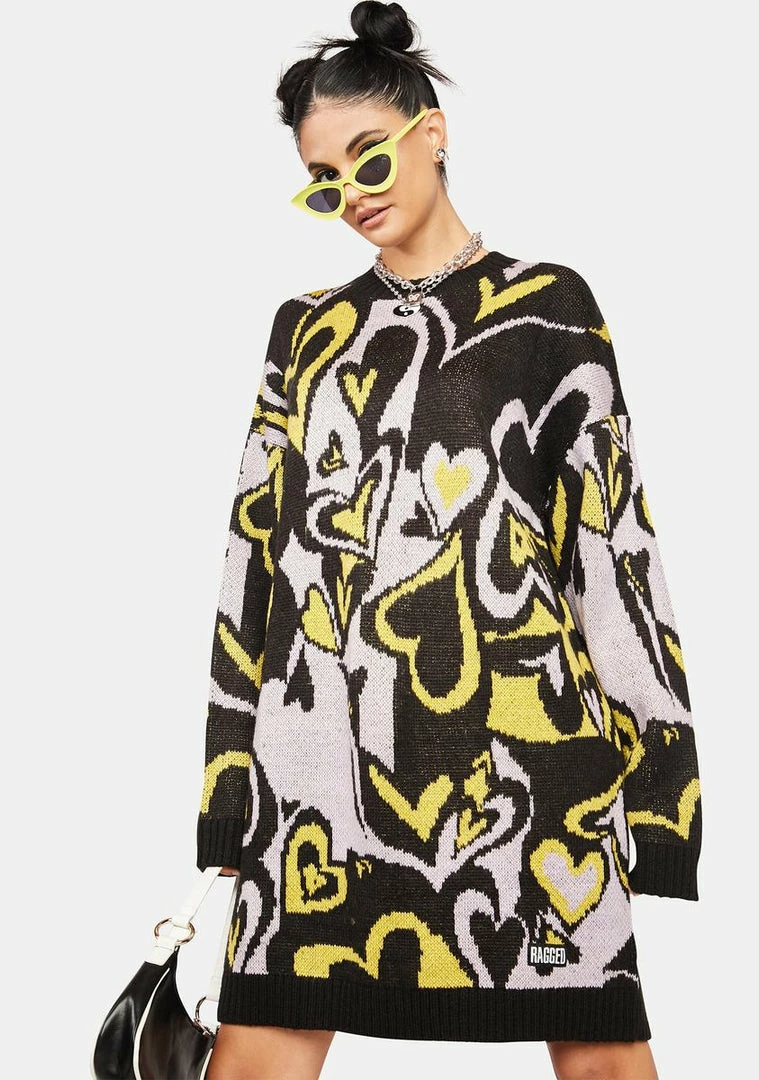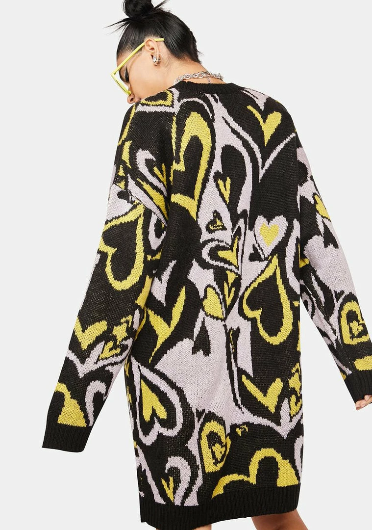 cuz you’ll always be loving! This knit sweater dress has long sleeves, an oversized fit, and a heart print all over.