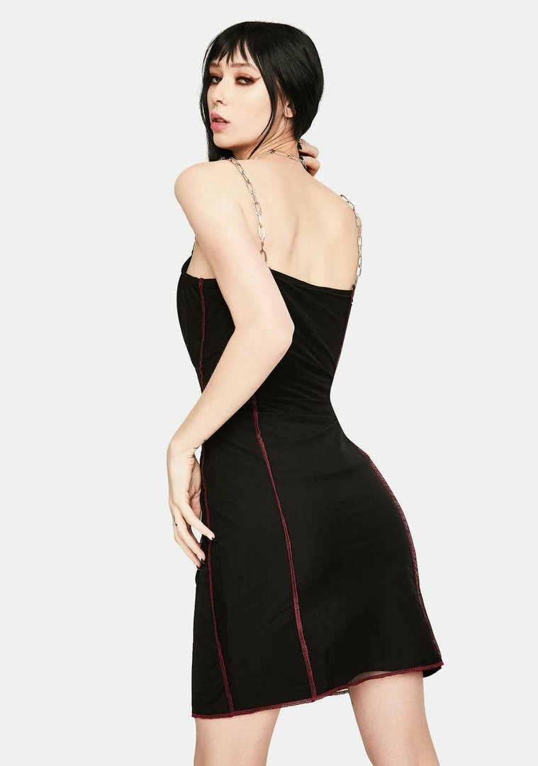 get into it, babe. This mesh overlay mini dress has chain straps, ruching on the bust, and red contrast overlocking seams.