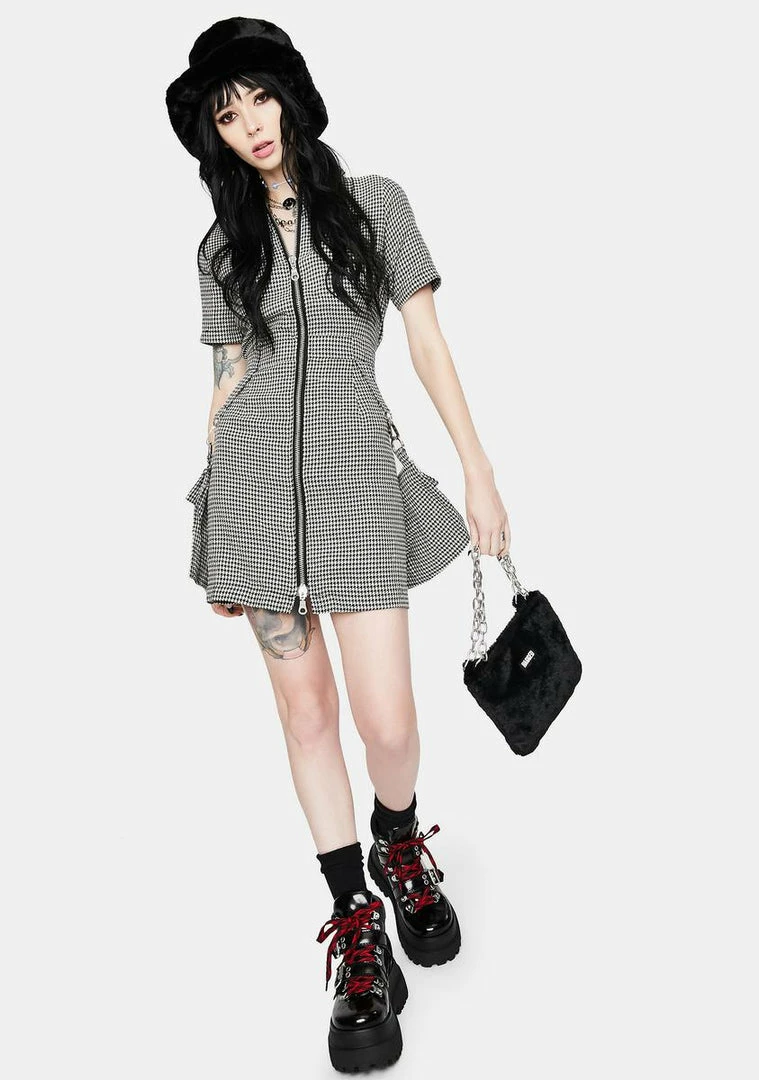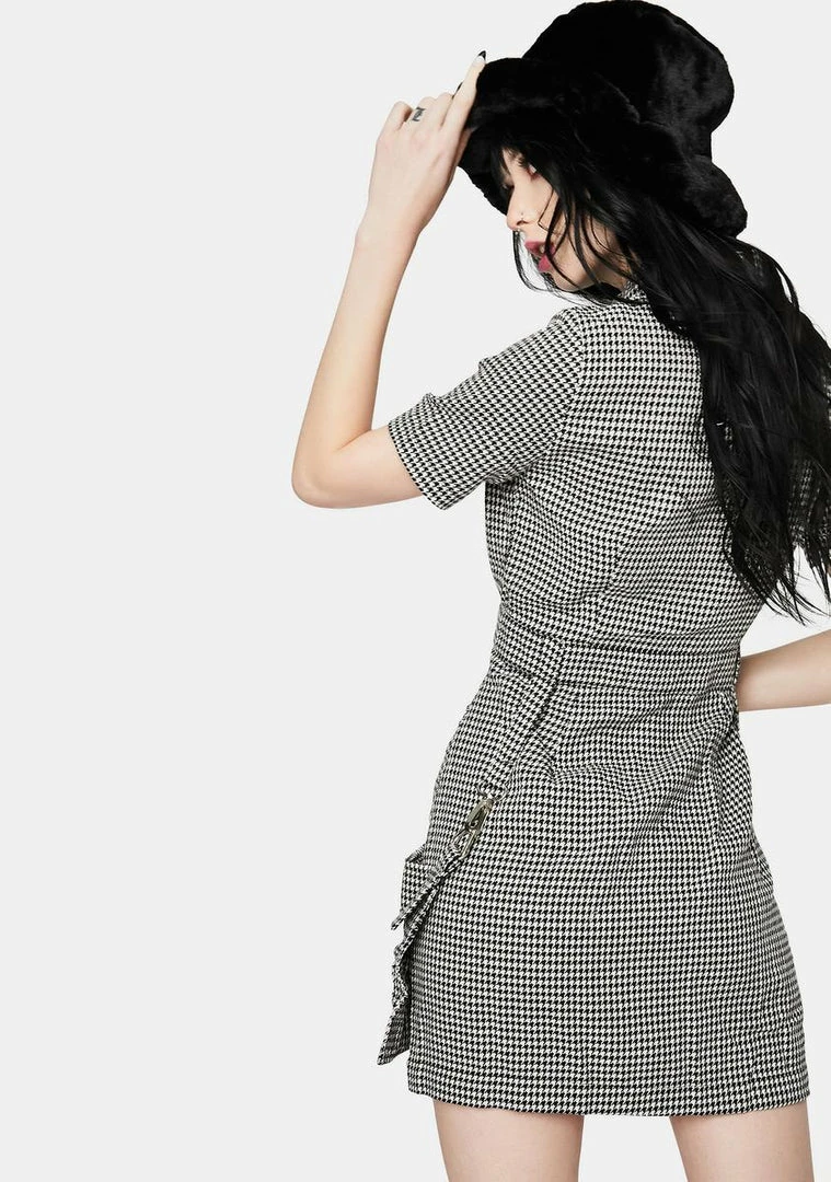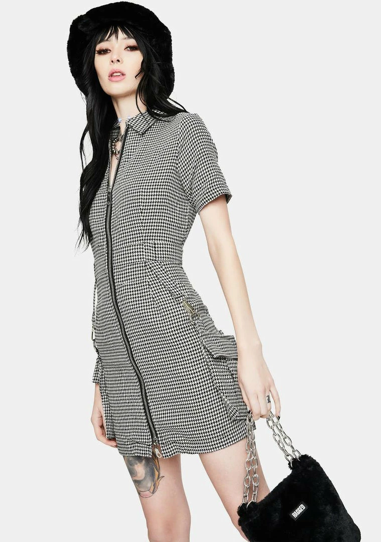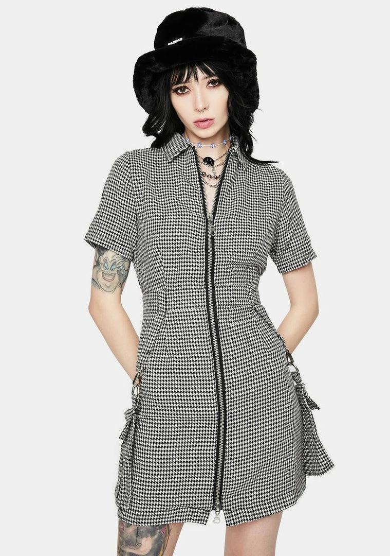 cuz nothingΓ’ΒΒs gonna stop you, babe. This short sleeve, collared mini dress has a houndstooth print, a zip up front, and detachable strapped side pocket details.