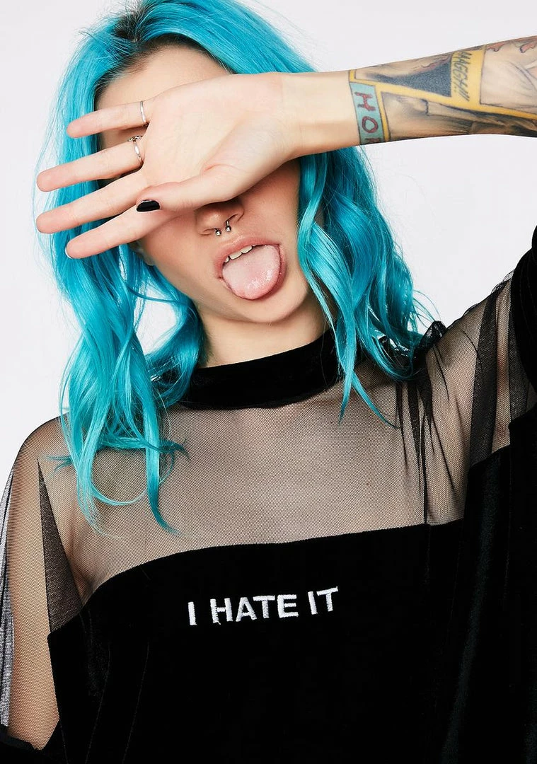 will tell Γ’ΒΒem what ya think. This black velvet dress has an loose NΓ’ΒΒ comfy fit, a sheer top panel, and white Γ’ΒΒI HATE ITΓ’ΒΒ text on the chest.