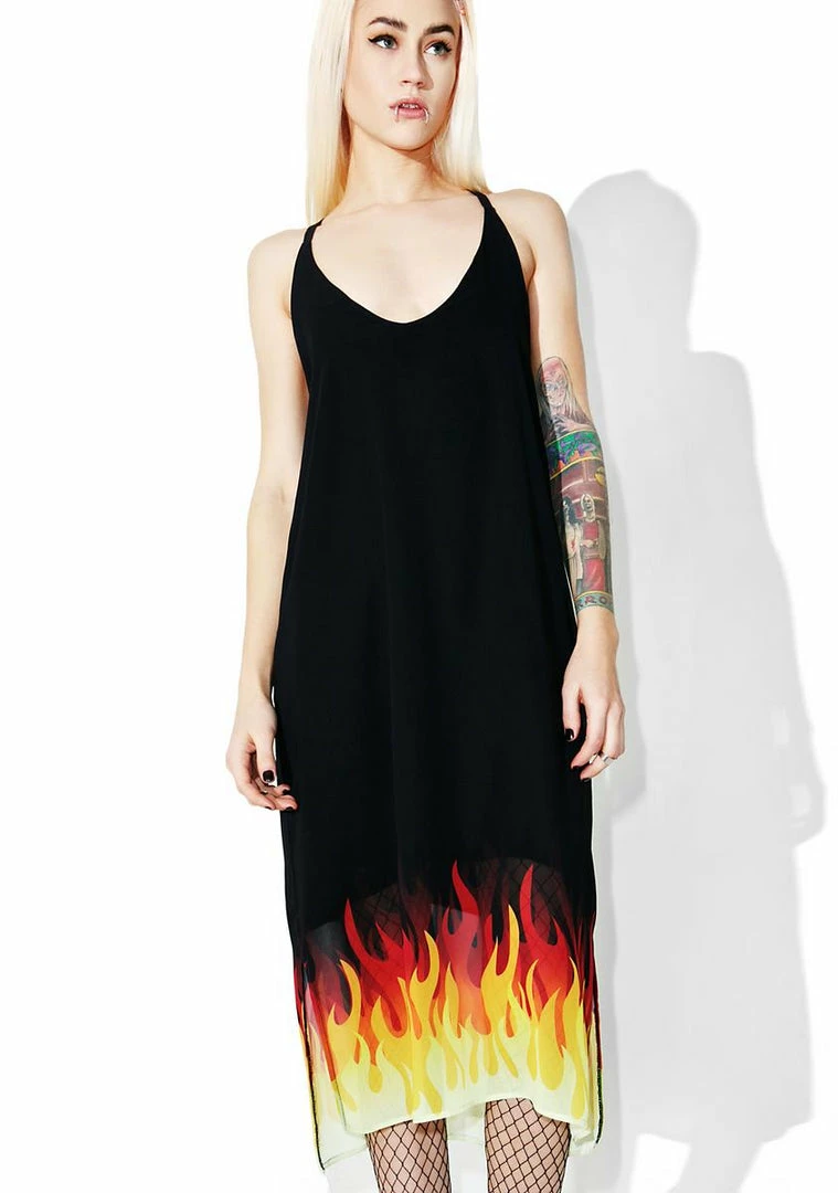 will have Γ’ΒΒem burninΓ’ΒΒ up fer yew, bb. Bring the heat in this dope dress that features a two layer construction, a scoop neckline, y-strap back, side slits, and blazinΓ’ΒΒ hot flamez burninΓ’ΒΒ up from da bottom.