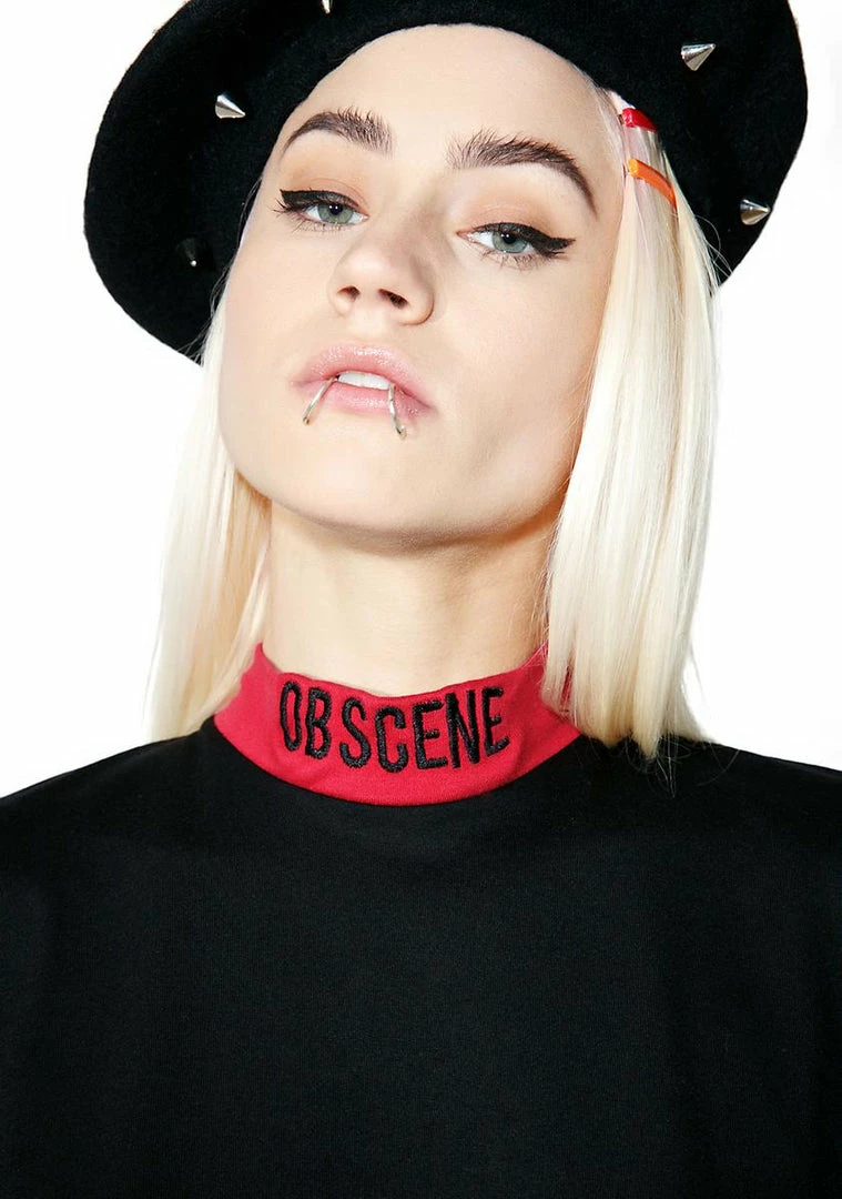…did I mislead you at some point, bb? Show Γ’ΒΒem yer true self in this dope mini dress, featurinΓ’ΒΒ a swingy black construction, dropped waist, ruffled hemline, cropped sleeves, red banding, and mock neck with embroidery across the front reading Γ’ΒΒOBSCENE.Γ’ΒΒ
