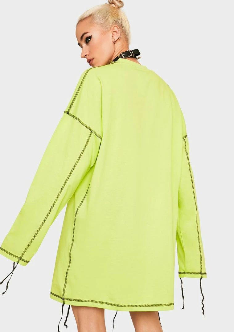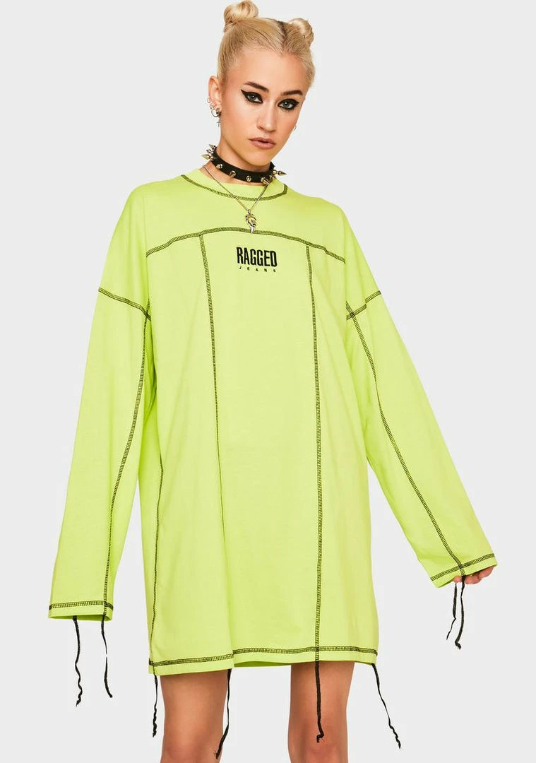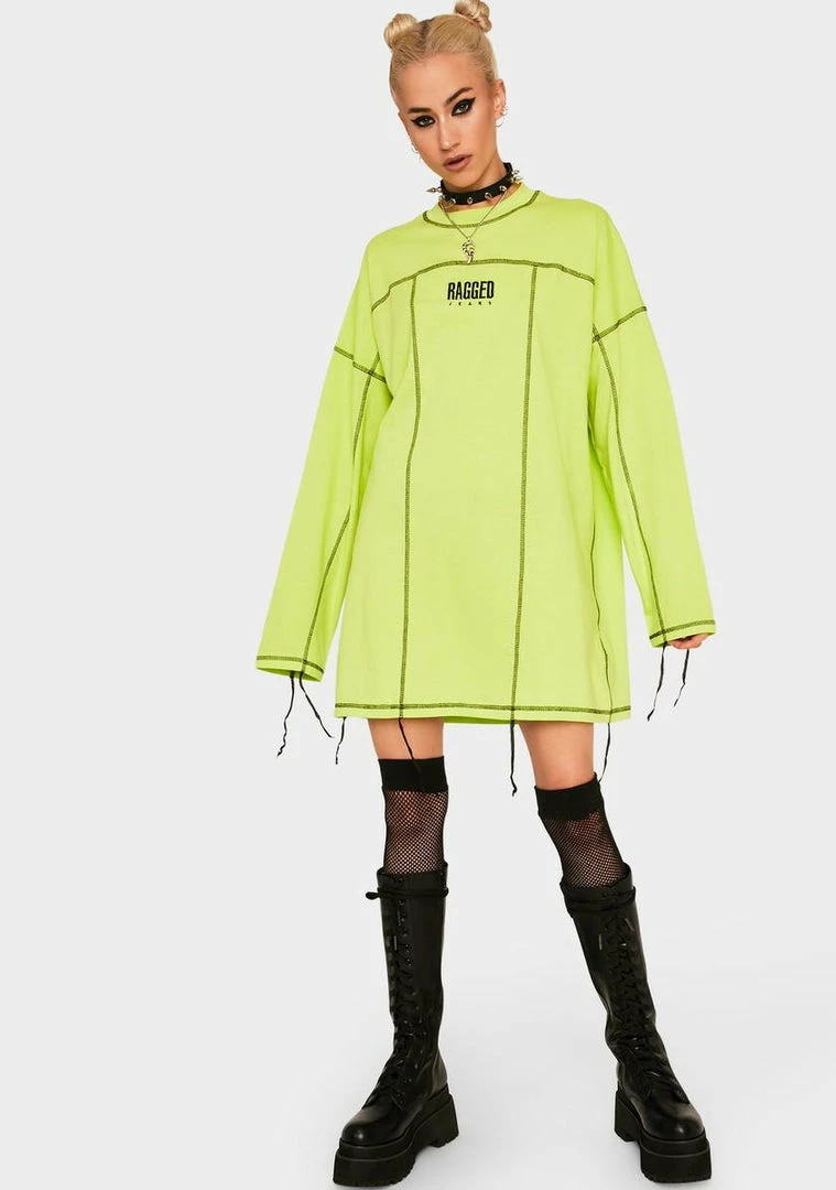 for peeling back your layers. This neon paneled dress features exposed seams, distressed hem, and embroidered logo on the front.