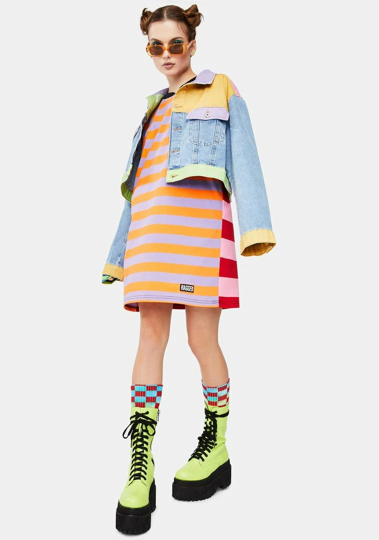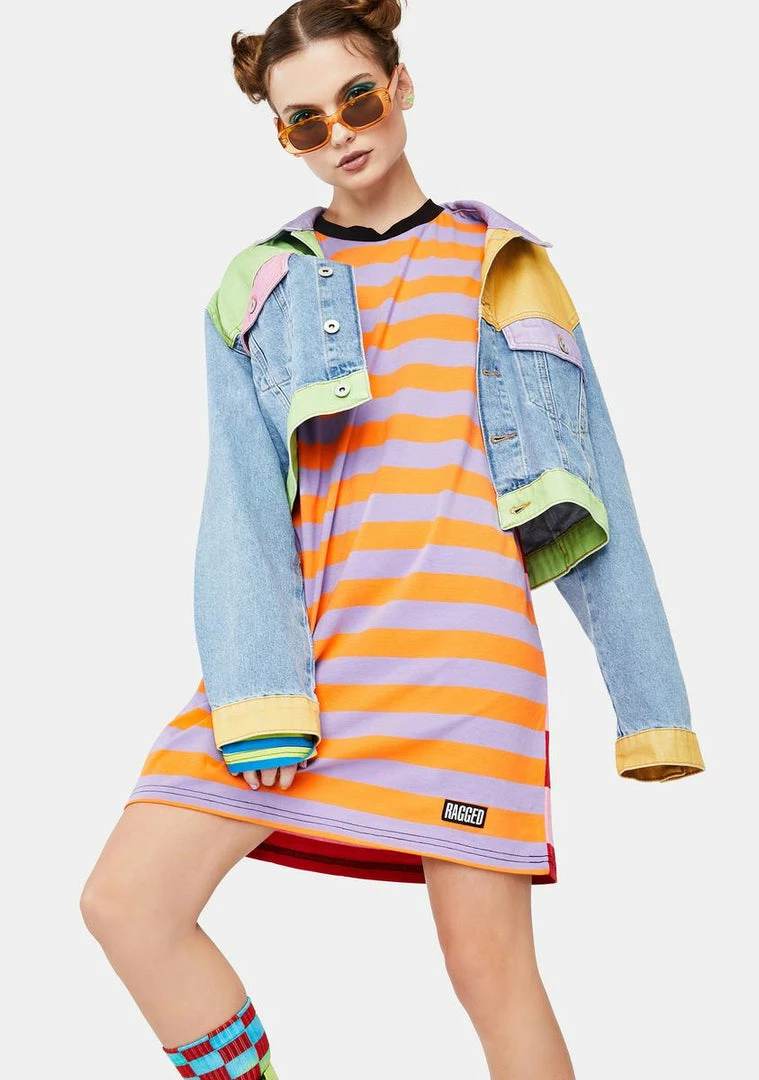 is a jersey knit mixed stripe skater dress with an oversized fit, a contrast black ribbed neckline, and a logo tab graphic on the front.
