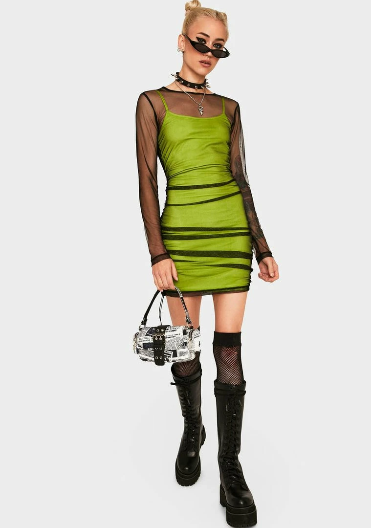 ur a betch, a boss N’ shine like gloss. This long sleeve mini dress has a bodycon fit, N’ mesh overlay.