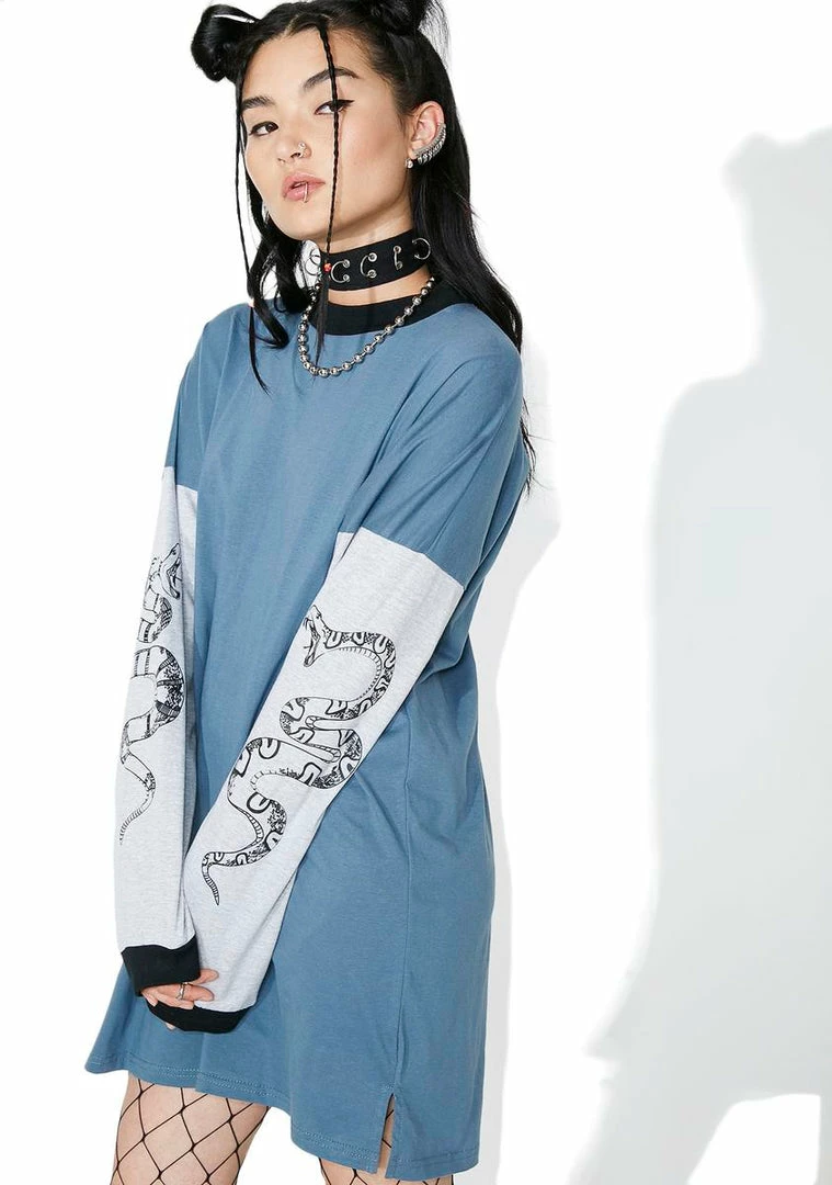feelinΓ’ΒΒ kinda slithery, bb? This sssssssssikk oversized t-shirt dress features a soft cotton construction, ribbed crewneck and cuffs, and contrasting long sleeves with snake print.