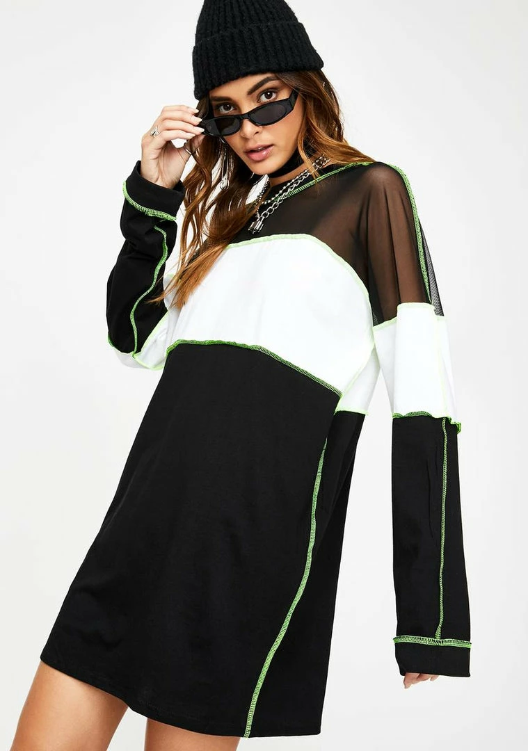 gotcha livinΓ’ΒΒ life to the maxxx babe! Make moves in this sikk long sleeve mini dress that has color block panels, exposed stitching and a supa relaxxxed fit.