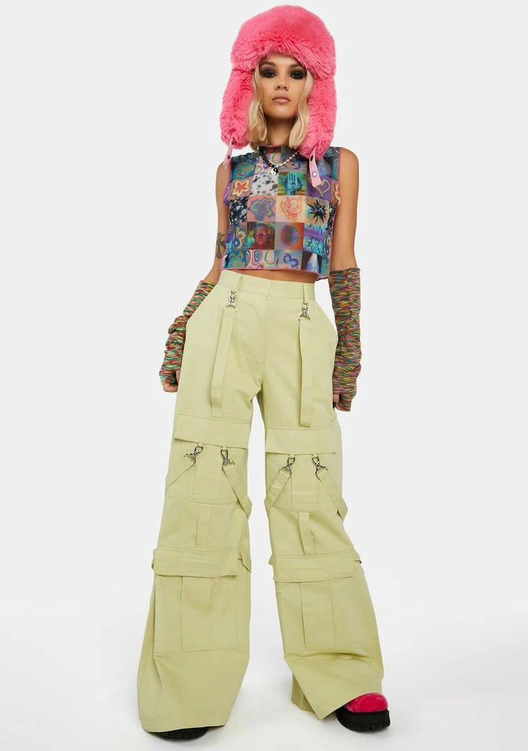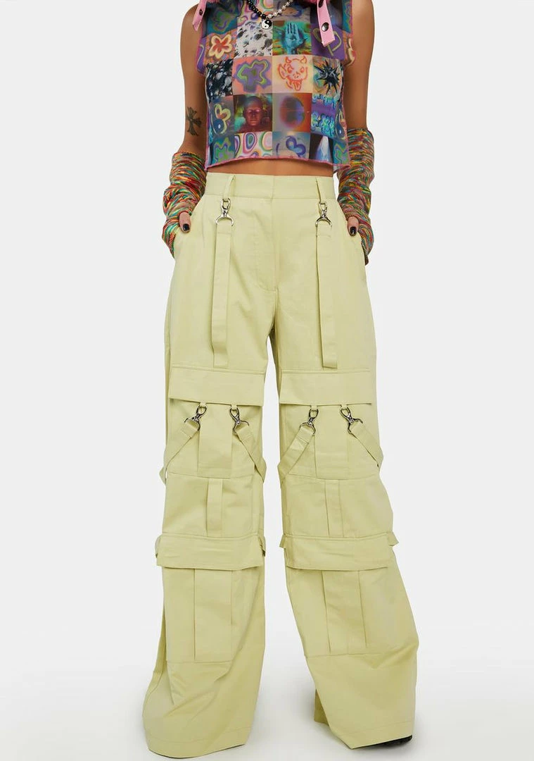 cuz you’ve got the look. These pants have a cotton construction, cargo pockets, harness straps, 8 functional pockets, a wide leg silhouette, a high rise fit, and a button and zip closure.