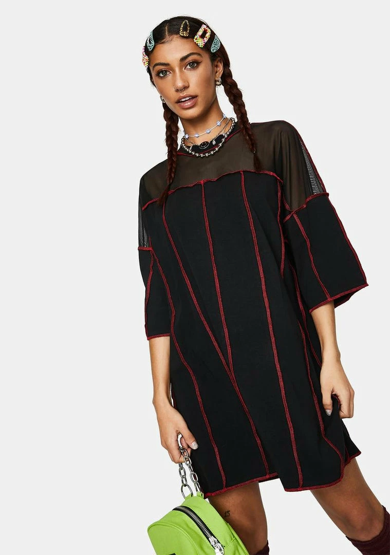 cuz you always have the gossip. This oversized skater tee dress has half-length sleeves, a mesh top panel, and contrast red stitching all over.