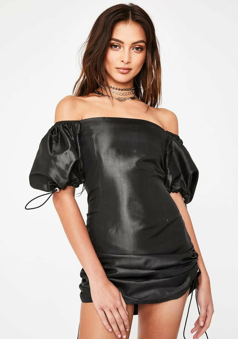 cuz youΓ’ΒΒre always keepinΓ’ΒΒ it cute for them! Stay charming in this ruched taffeta mini dress that has toggle drawstring details, a back zip closure, and big puff sleeves that can be worn on or off the shoulder.