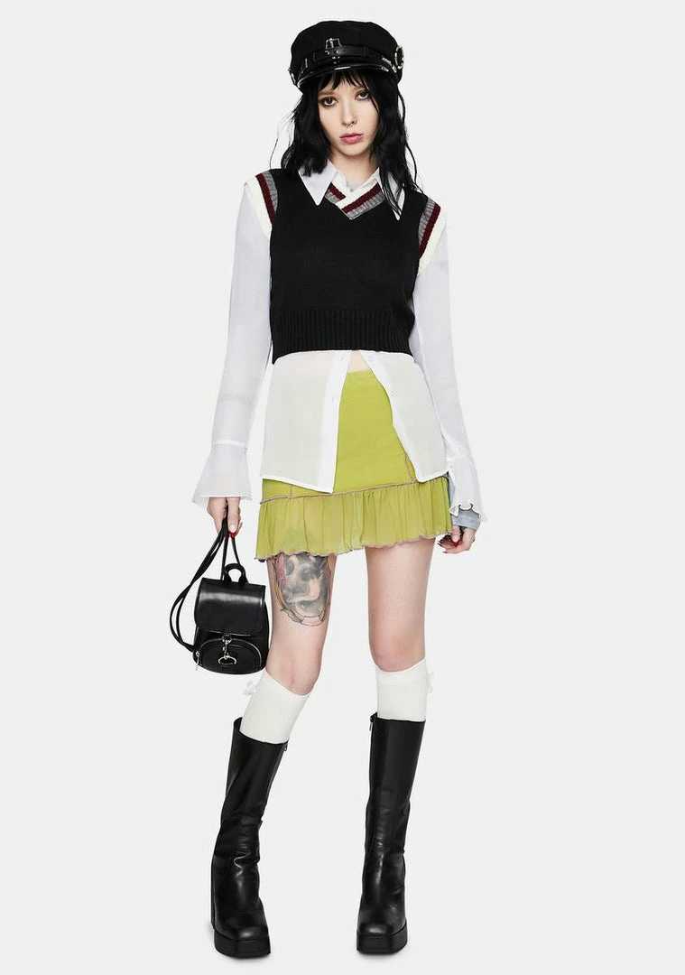 cuz youΓ’ΒΒre ahead of the class. This knitted vest has a cropped fit, a V-neckline with ribbed trim, and stripe details.