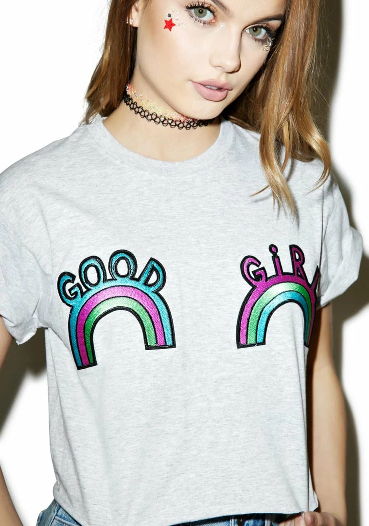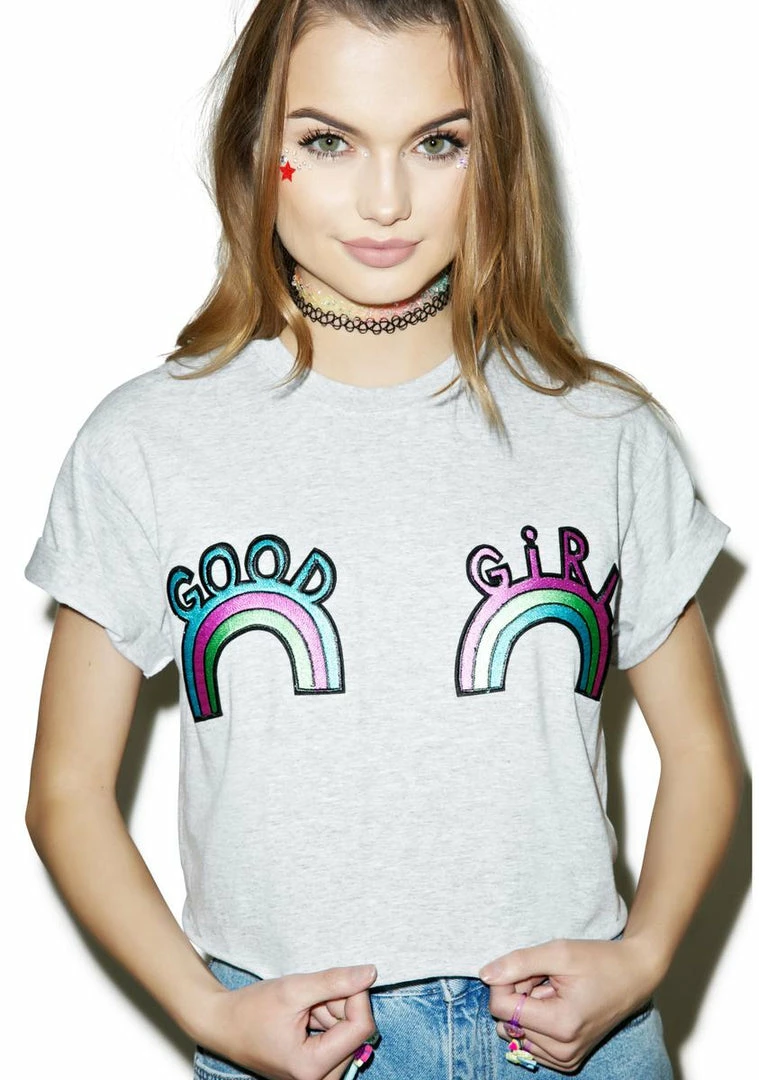becuz ya havenΓ’ΒΒt gone bad just yet, bb. Show off yer angelic charm in this cute short sleeve cropped tee, featuring a crew neckline, boxy fit, and two rainbow arches over yer bewbs reading Γ’ΒΒGood GirlΓ’ΒΒ (for now).