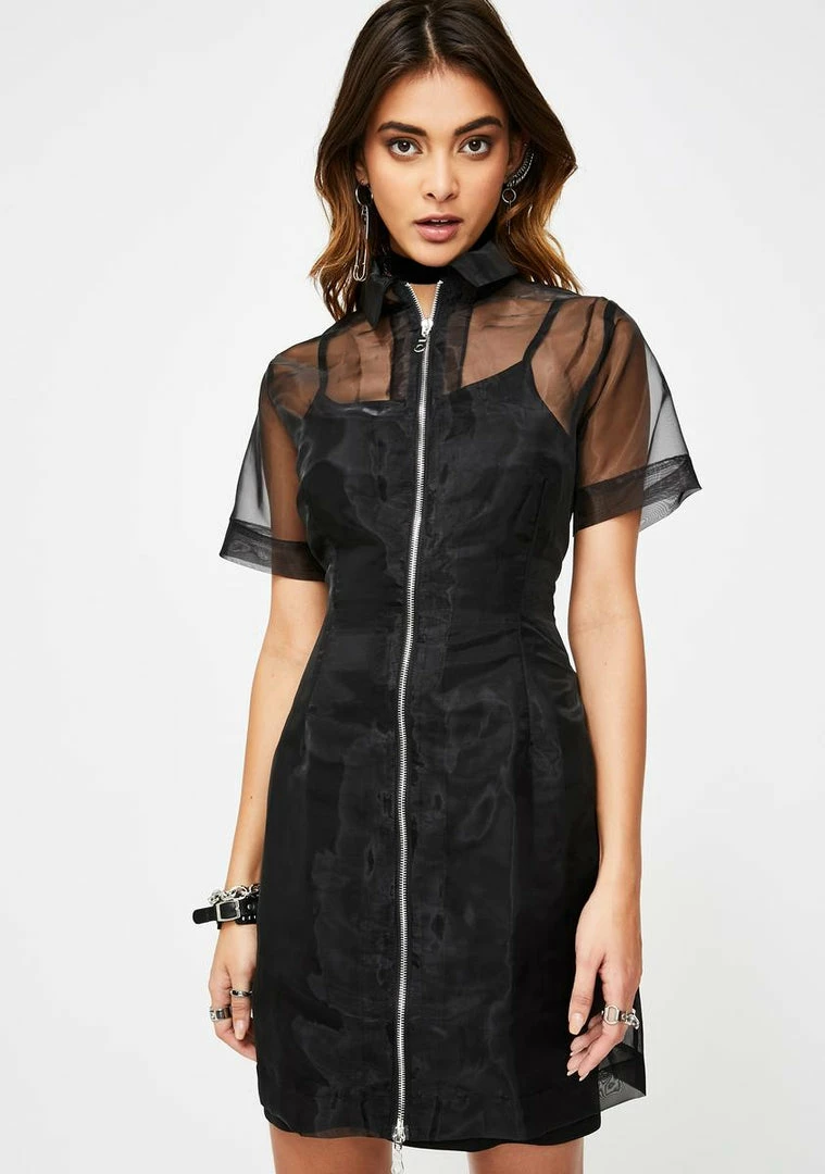 gotcha doinΓ’ΒΒ what it takes, babe. Crack their code in this hott short sleeve mini dress that has a sheer overlay, pointed collar and front zip closure.